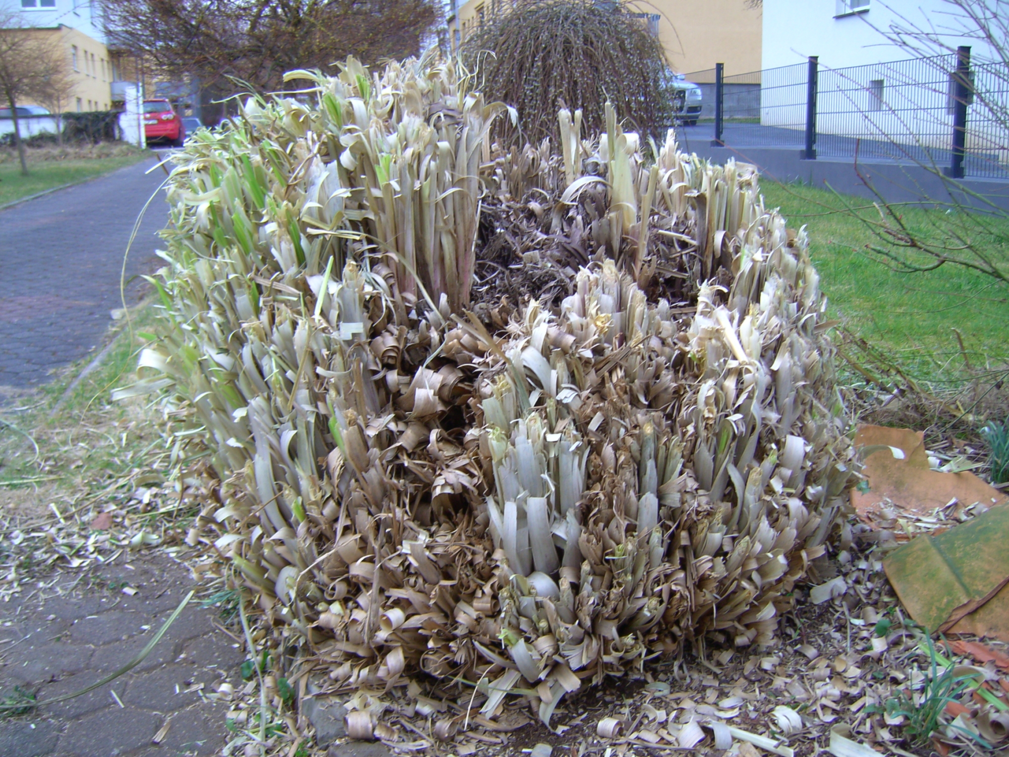ich hab mir hier mal ein bißchen angelesen, was das Thema Pampasgras betrifft. Wir haben nämlich im letzten Jahr ein Haus mit Garten gekauft, in dem u.a. 5 Pampasgräser stehen. Wir sind erst kurz vor Weihnachten eingezogen und hatten so dermaßen viel zu tun, dass mir nicht aufgefallen ist, dass der Vorbesitzer das Pampasgras nicht zusammengebunden hatte. Ich hätte eh nicht gewusst, dass man das tun muss. Jetzt habe ich mich heute mal mit der Heckenschere daran gemacht, das ganze Zeug runterzuschneiden. 4 Horste habe ich bis auf etwa 20cm zurückgeschnitten, bei dem letzten hab ich mich dann nicht mehr getraut. Ich glaube, der Vorbesitzer hat das Gras bloß auf etwa 1m Höhe zurückgeschnitten. Da drunter war alles ganz dicht und fest. Aber alle Horste sind innen drin so richtig braun und das ganze Zeug ließ sich in vielen Stellen in der Mitte einfach so rausziehen. Was mache ich jetzt? Das ganze vermoderte Zeug rausholen und die Horste alle auf 20cm runterschneiden oder besser nicht? Bin da echt überfragt, hatte noch nie einen Garten. Hier mal ein Bildchen: