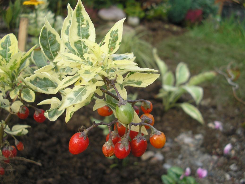 Der panagierte bittersüße NAchtschatten ist doppelt schön. Er hat schöne rote Früchte und schöne elegante Blütechen die vor dem bunten LAub noch viel besser wirken als bei der Wildform.