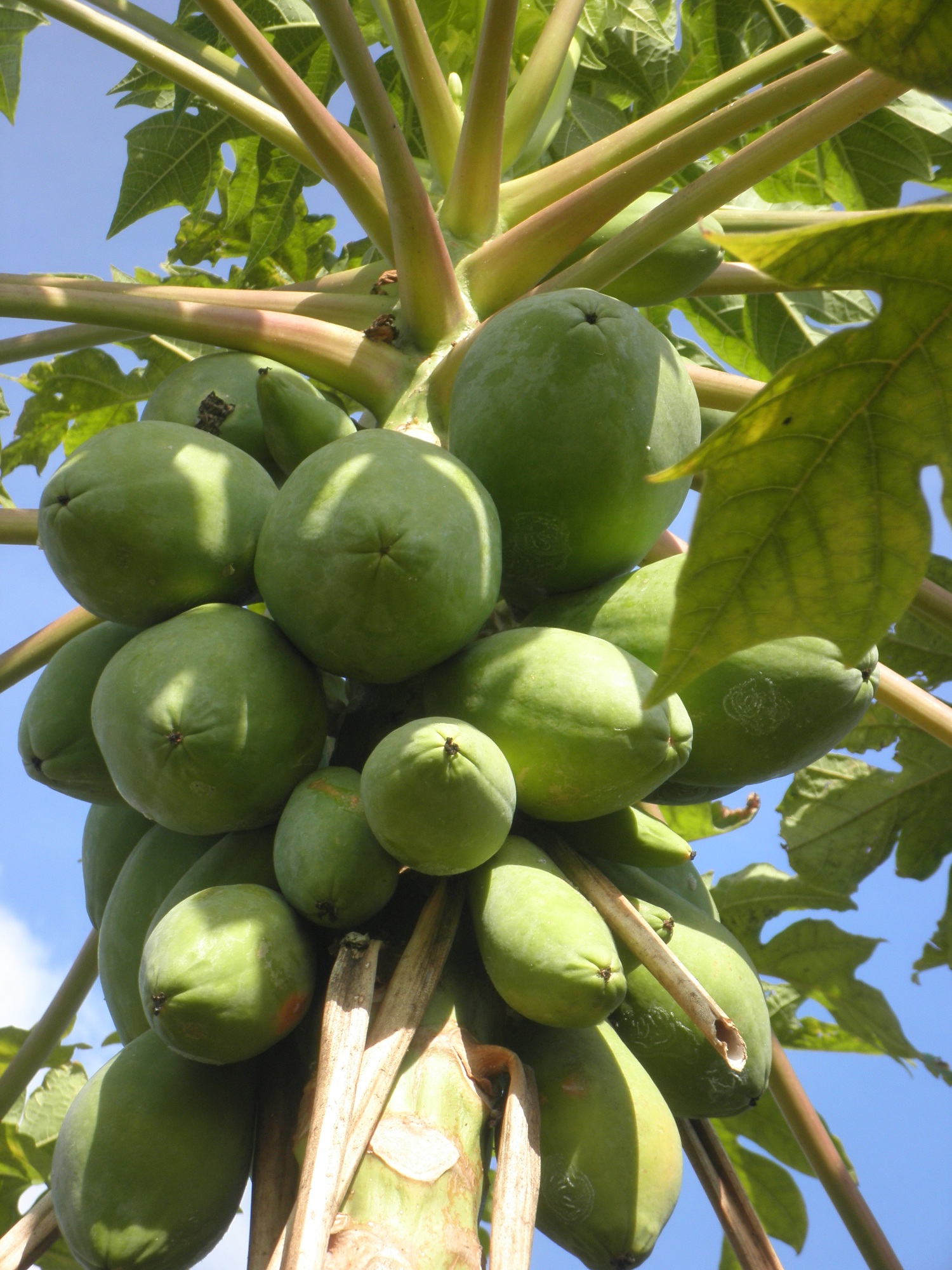 Da ich ganz gluecklich bin, mit meiner Papaya, die ich aus Supermarktfruchtsamen gezogen habe, melde ich mich mal. Dazu erstmal, hier in Florida habe ich natuerlich Superklimabedingungen fuer Papaya. Es gibt ja verschieden grosse Papayafruechte. Meine sind die kleineren Solopapayas (hawaianische), meine Nachbarn haben alle kiloschwere Fruechte. Natuerlich schmecken meine am Besten!