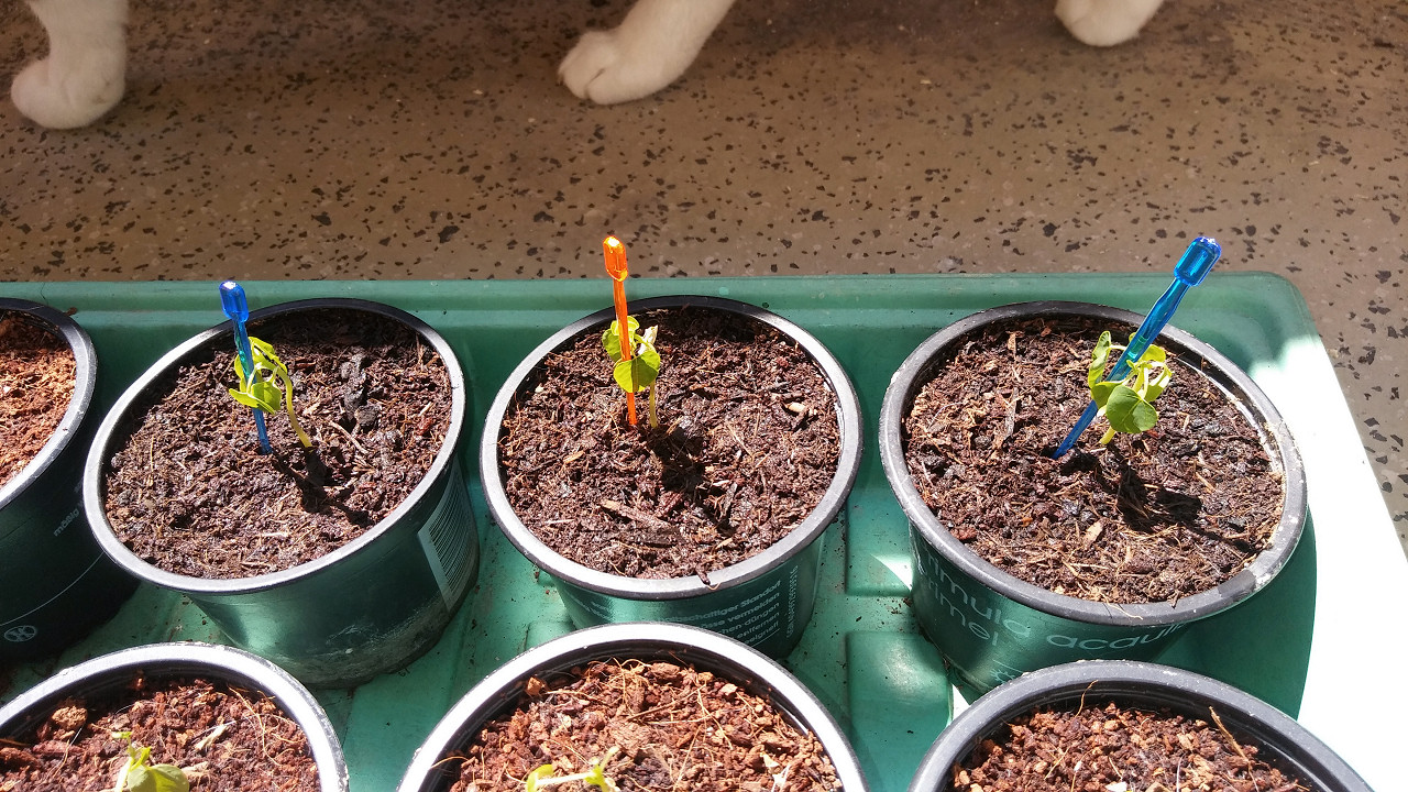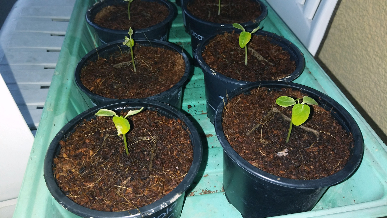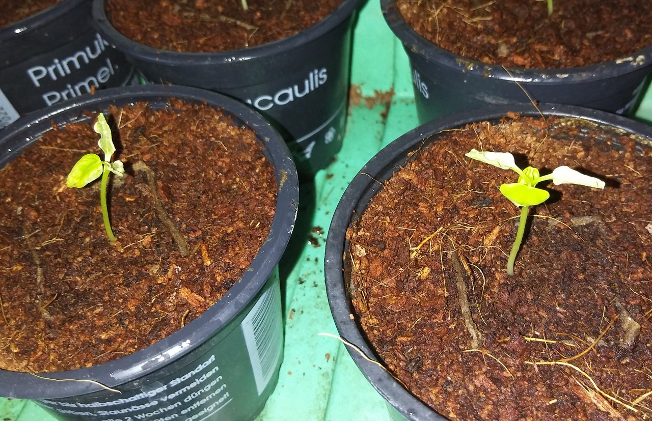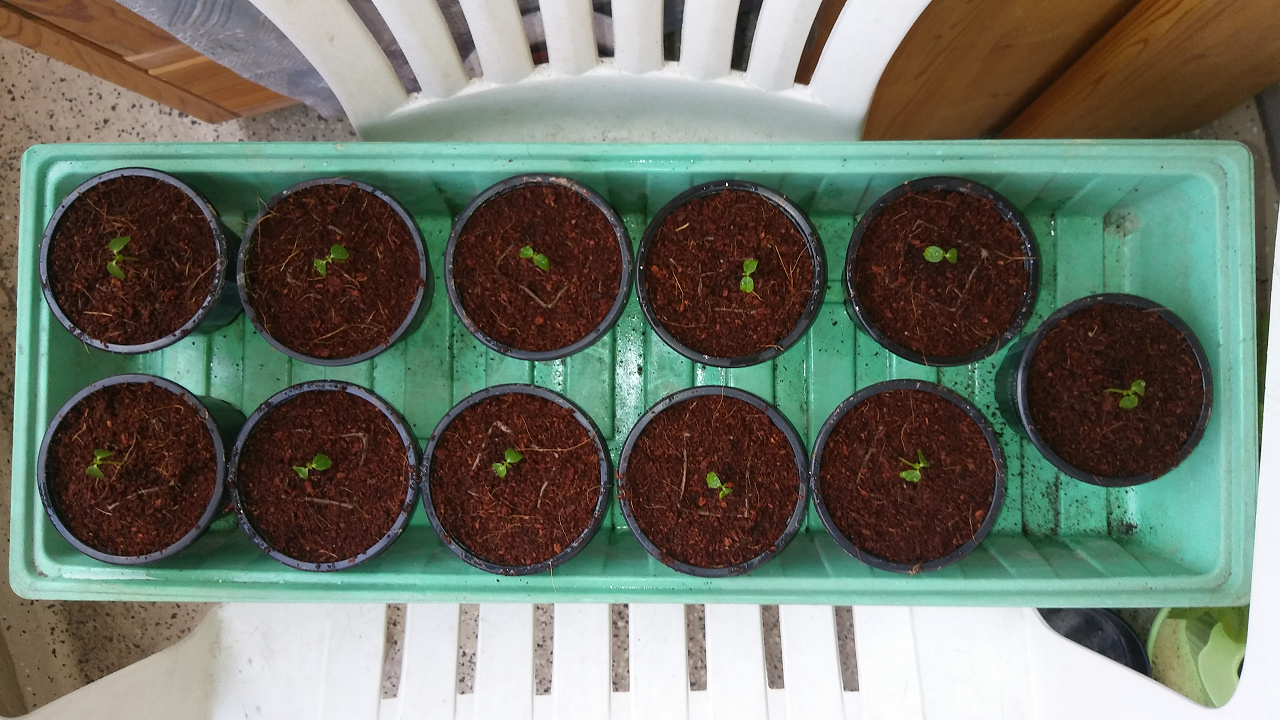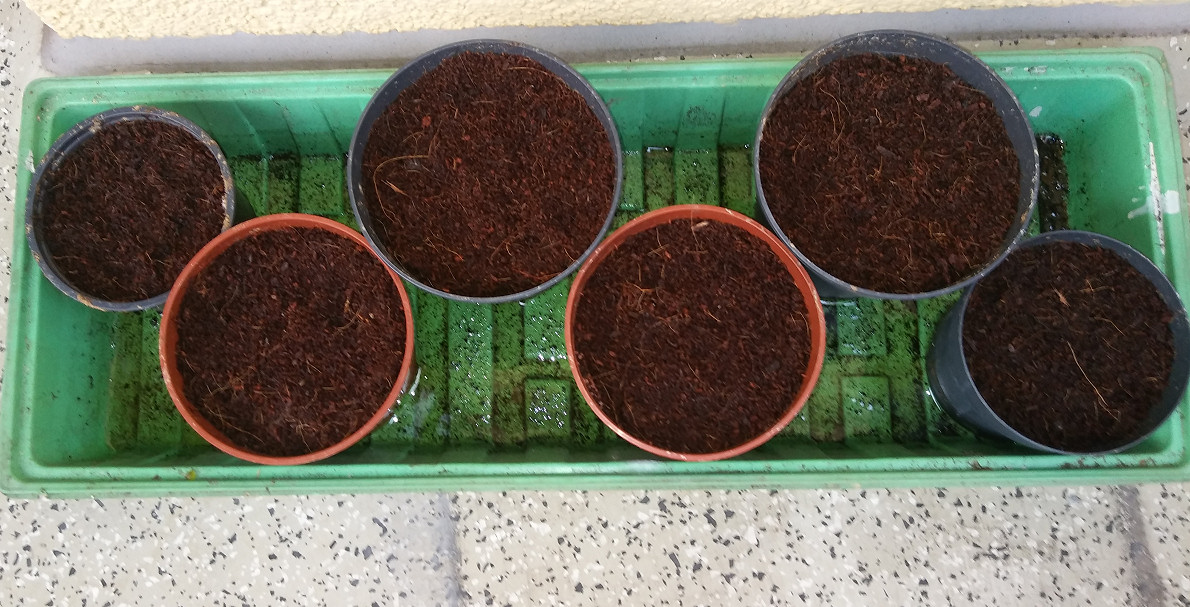 Außerdem hab ich als Experiment noch meine alten Rosenverkaufstöpfe geholt, mit Kokoszeugs gefüllt und die restlichen Kerne, die ich übrig hatte, da rein verteilt. Die stehen draußen an der Wand neben der Balkontür und werden dort auch gelassen. Sie kriegen Hitze und Kälte ab, Schatten und auch sehr viele Sonnenstunden und je nachdem wie stark es regnet und dabei windet, kann es auch mal rein regnen. Sie stehen auch grade noch ziemlich nass, damit die Erde nicht durchtrocknet, wenn stundenlang die Sonne draufknallt. Will einfach sehen, ob da auch welche Keimen. Wenn ja, dann müssten die ja robuster sein, als die verhätschelten, die jeden Abend wieder in die warme Wohnung gestellt werden, solange es nachts noch etwas kühl wird.