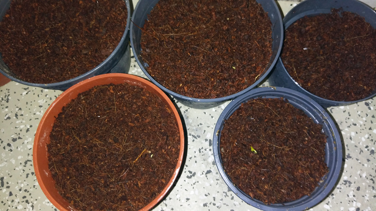 Außerdem hab ich als Experiment noch meine alten Rosenverkaufstöpfe geholt, mit Kokoszeugs gefüllt und die restlichen Kerne, die ich übrig hatte, da rein verteilt. Die stehen draußen an der Wand neben der Balkontür und werden dort auch gelassen. Sie kriegen Hitze und Kälte ab, Schatten und auch sehr viele Sonnenstunden und je nachdem wie stark es regnet und dabei windet, kann es auch mal rein regnen. Sie stehen auch grade noch ziemlich nass, damit die Erde nicht durchtrocknet, wenn stundenlang die Sonne draufknallt. Will einfach sehen, ob da auch welche Keimen. Wenn ja, dann müssten die ja robuster sein, als die verhätschelten, die jeden Abend wieder in die warme Wohnung gestellt werden, solange es nachts noch etwas kühl wird.