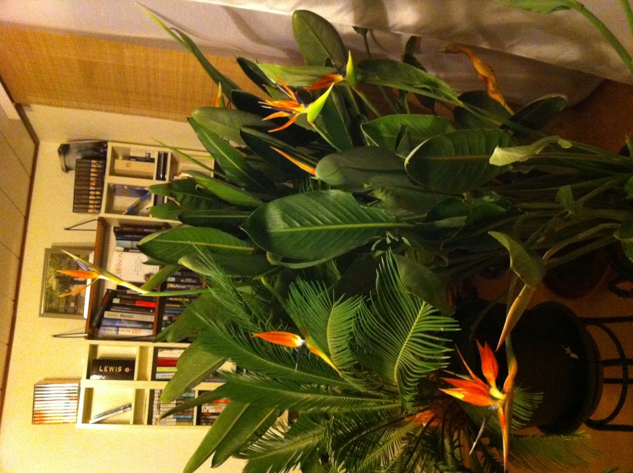 Jetzt hat sie drei neue Blüten, zwei sind schon am blühen eine ist noch geschlossen. Die Gesamthöhe der Strelizie mit Topf ist jezt 1,90m.