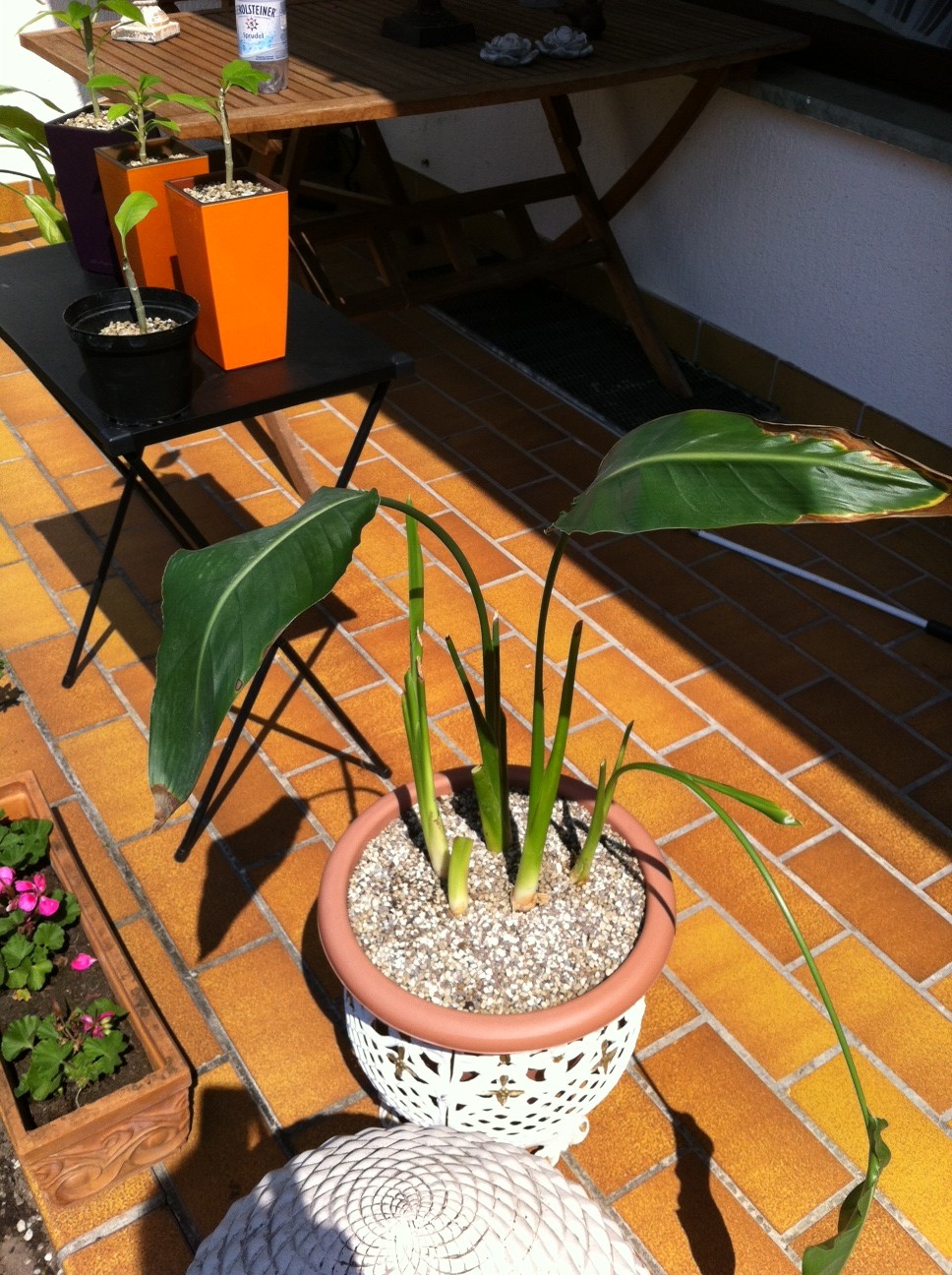 Also ich hatte im Sommer meine Strelizie in Lechuza gesetzt (50er Topf) und sie stand den ganzen Sommer über auf der Terrasse. Anfang November hab ich sie dann in die Wohnung geholt und sie in mein Studio gestellt, dort kann ich die Heizung etwas kühler stellen und die Katze geht da nicht an den Topf mit den schönen Steinchen. Leider ist es dort nicht so hell, also hab ich mir einen extra Strahler besorgt und diesen über der Strelizie angebracht sodass sie von 9-21 Uhr meines erachtens genug Licht hat.