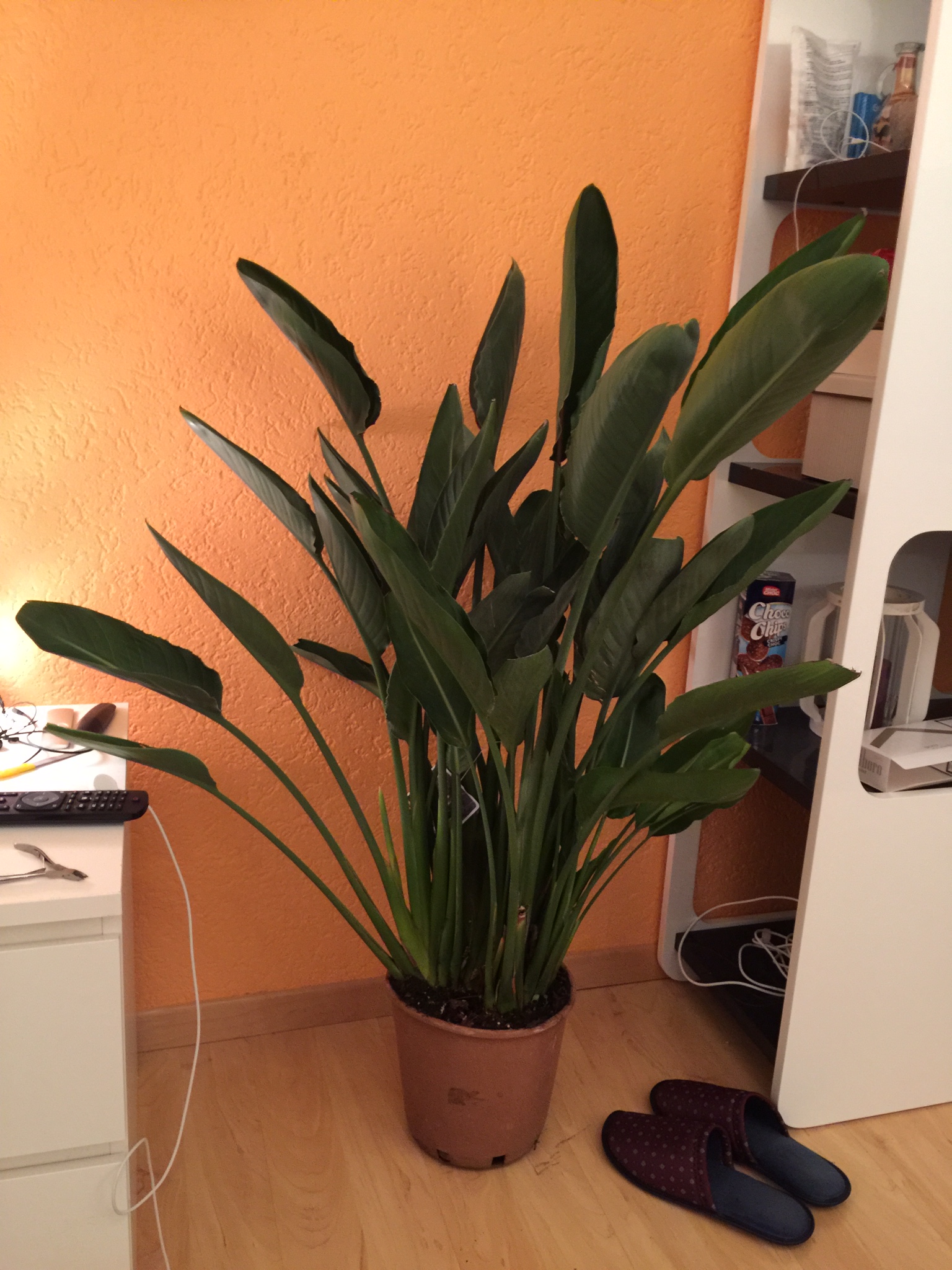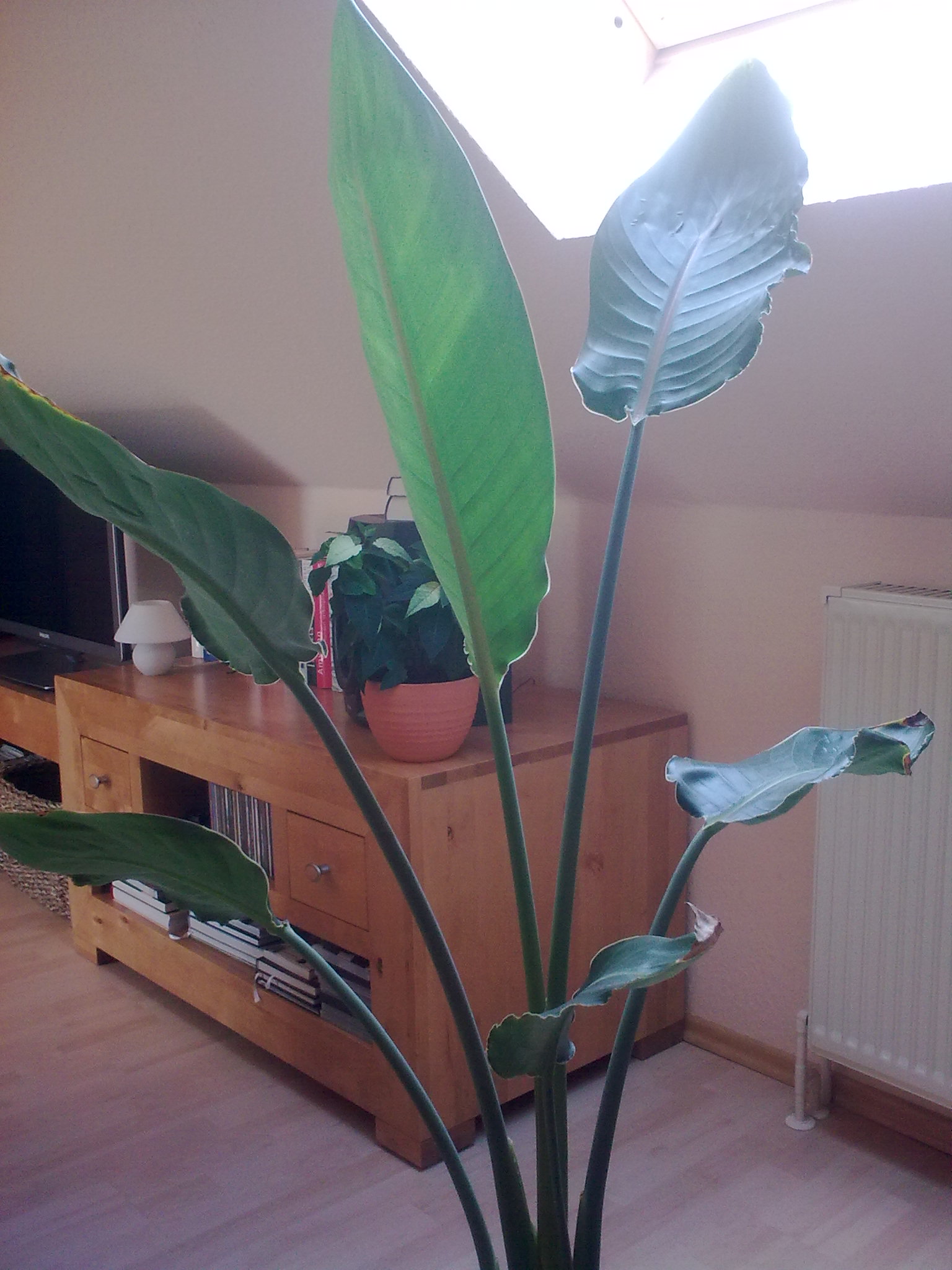 habe mir nun eine Strelitzie gegönnt. Eine andere als ursprünglich geplant. Sie ist ca. 1.30 m und es sind 4 Pflanzen im Topf. Der Topf ist relativ eng, was den Strelitzien anscheinend gut tut. Die eine Grosse scheint sich zu teilen. Die Pflanze sieht sehr kräftig und gesund aus.