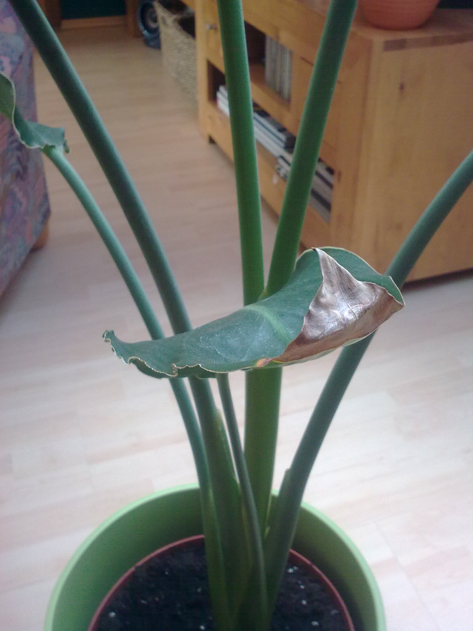 Auch wenn man eigentlich einen grünen Daumen hat, kann allerlei schief gehen. Für meine S. reginae war der Topf schon zu klein. Unten kamen die Wurzeln bereits durch und oben hatte die Pflanze - immerhin schon 10 über 1m hohe Blätter - nicht mehr viel Halt. Also umtopfen. Ich war wohl etwas zu energisch, da der Wurzelballen gar so fest steckte... naja, jedenfalls rissen die Wurzeln zu gut der Hälfte ihrer Masse ab Jetzt ist die Pflanze seit etwa einem Monat frisch getopft, Wasser bekommt sie nur mehr als sparsam. Trotzdem mußte ich schon 4 der äußersten Blätter abschneiden. Komplett gelb geworden und dann braun. Der mittlere Teil ist zwar noch grün, aber ob sich die Strelizie noch erholt, steht in den Sternen.