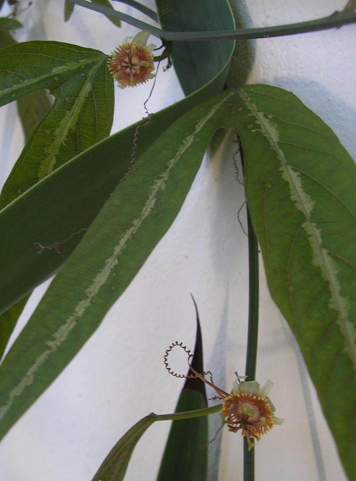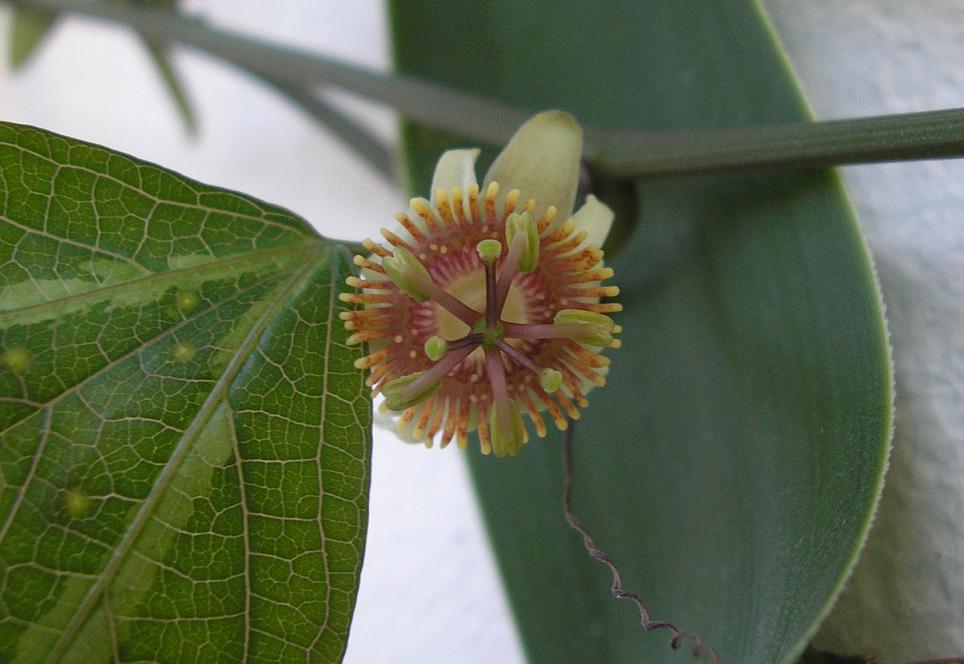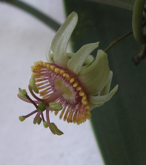 Blütenbeschreibung: Winzige kleine Passiflorablüten nur 1 bis 2cm Durchmesser, Blütenblätter grünlich und zurückgeschlagen, Fäden rötlich bis orange mit gelben Spitzen