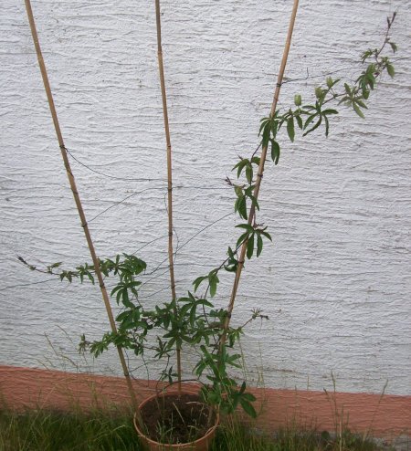 meine Passis stehen zwar auch an einer Mauer und bekommen in absehbarer Zeit auch ein Rankgerüst, aber ich hatte das eigentlich nicht vorgesehen und hab sie deshalb im Kübel so gepflanzt, dass sie auch ohne Mauer stehen und wachsen könnten. Ich habe mir pro Topf 3 lange Bambusstäbe gekauft (1,50 wenn ichs grad richtig weiß), sie am Rand in die Töpfe gesteckt, hab diese aber im Gegensatz zu vielen anderen nicht oben zusammengebunden. Die gehen nach obenhin auseinander und ich hab Pflanzendraht immer wieder in allen möglichen Richtungen und Variationen drumgewickelt. Die Passis hatte ich vorher auseinander gezoppelt, die waren ja auch zusammengebunden in den unfassbarsten Formen, und die paar Rankärmchen die ich hatte dann um den Draht gelegt. Beide Passis haben das sofort angenommen und klettern mit ihren neuen Ranken um die Drähte rum.