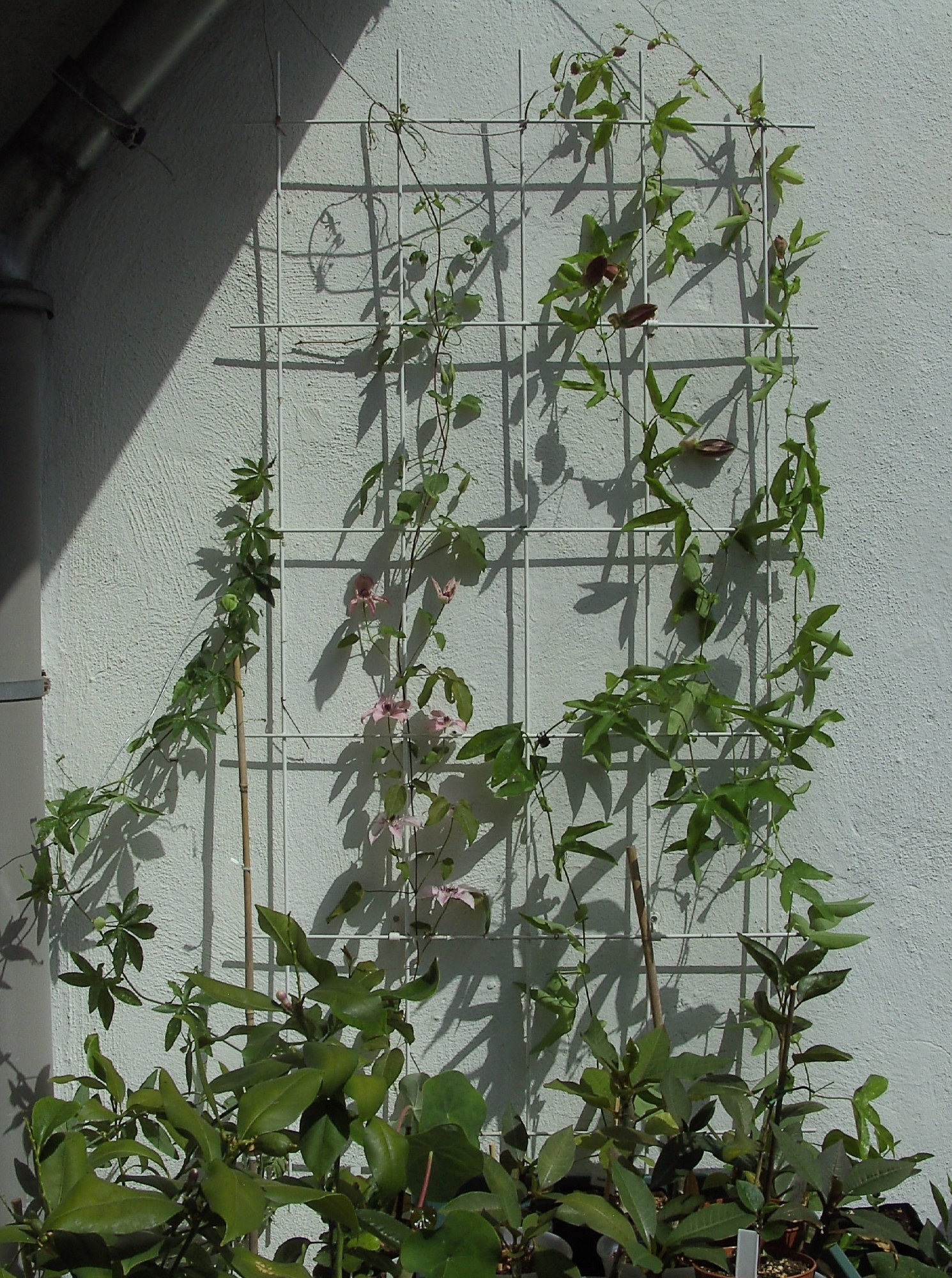 Den Drah rauszuziehen wäre nicht möglich gewesen - hab's versucht, aber die Pflanzen waren da 6-7 mal drumrumgeschlungen, um ihn und um einander verwachsen - keine Chance! Musste einige 'Fühlerchen' abschneiden und einige Knoten entwirren, bevor ich den Drah rausgekriegt habe. Die Nicht-Caerulea-rote-Blüten-möglicherweise-x-violacea hat immer noch ein paar Knoten in den untersten Trieben.