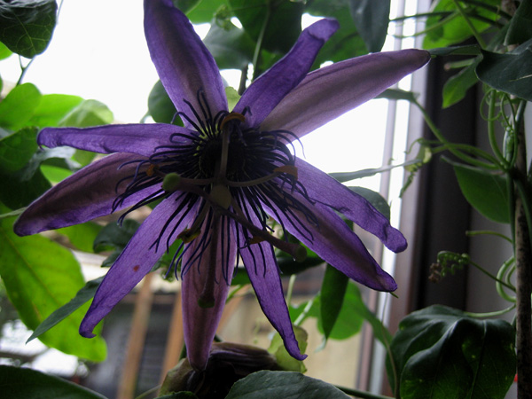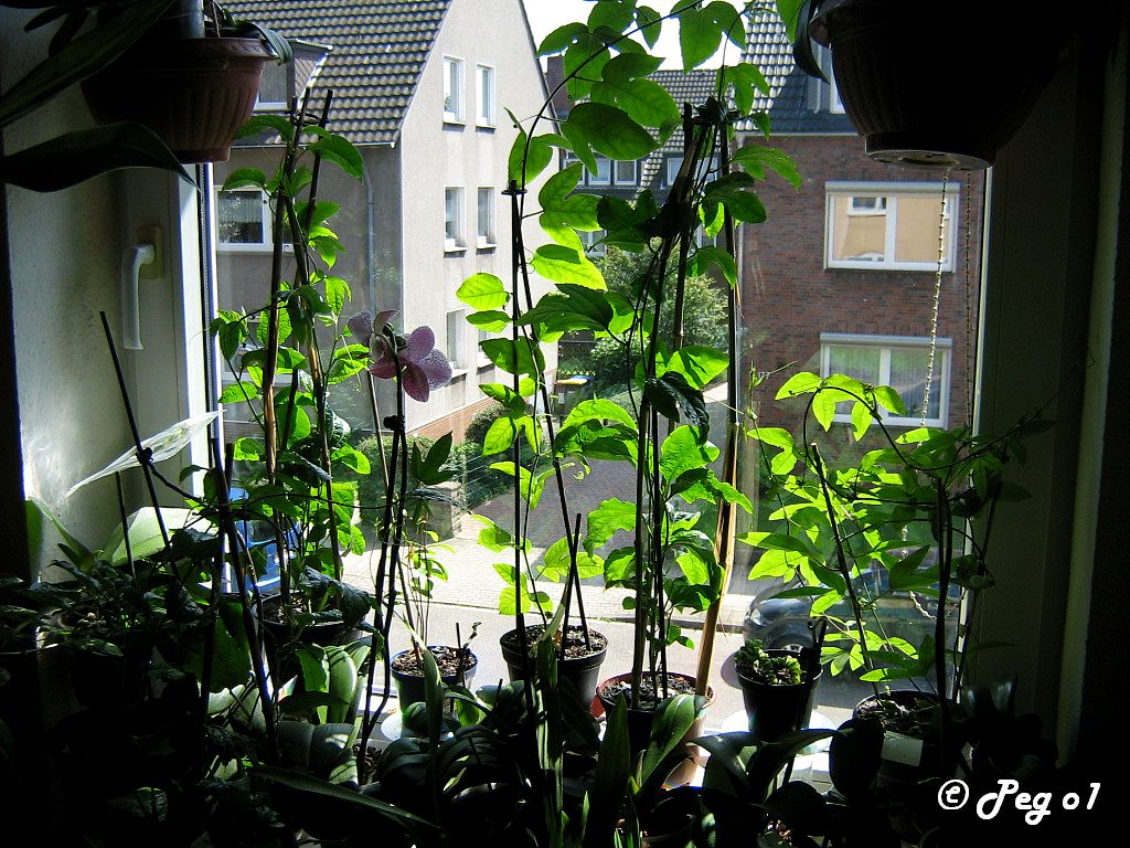 Zur Begrüßung auf`m Blumenbalkon gabs am Freitag morgen 6 Blüten an der Karwinskii, 3 dicke Früchtchen an der Violacea, immer noch recht viele Blüten an Citina und Adularia...und die "Norma-Edulis"-Caerulea-die ist mittlerweile an der Dachkanne (Regenrinne) angelangt und mehr als 3 Meter hoch, schätze ich... . (mehr als 50 cm gewachsen in den 10 Tagen...)