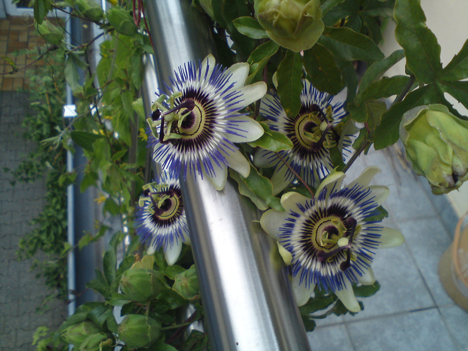 Fleißig sind P. 'adularis' und P. foetida: jeden Tag neue Blüten und noch viele Knospen. Von der P. foetida werd ich mich aber trennen - was soll ich mit einer Passi, die dann blüht, wenn ich noch schlafe und bereits verblüht ist, wenn ich aufstehe