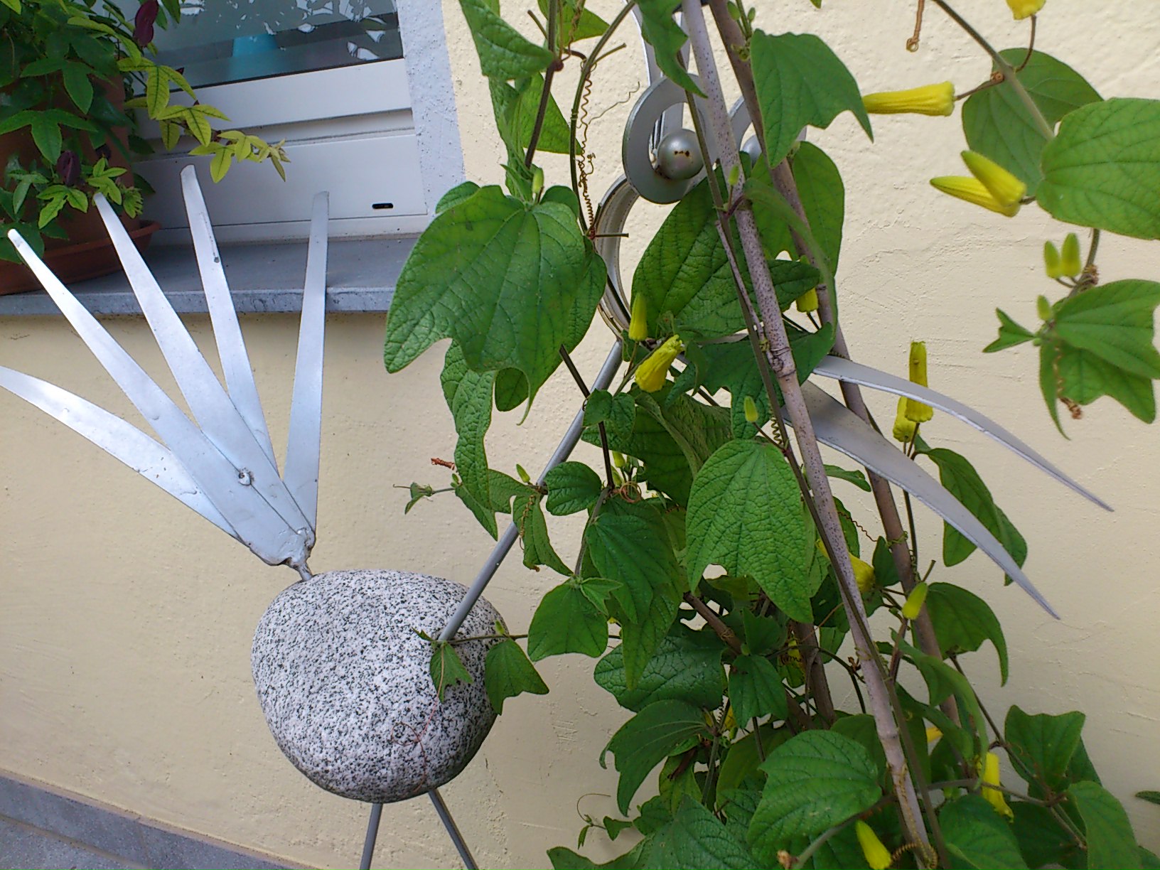 Und die Citrina wird gestützt von meinem Blechvogel-der steckt seinen Kopp dadurch...der lange Trieb war quer durch die Caerulea gewachsen, dafür hatte die Caerulea ein paar der Rankstecken drr Citrina in Beschlag genommen...sah niedlich aus... ....ach und links im Bild ist noch 'n dickes Knospie von der PV... ..geht hoffentlich zum Saisonfinale auch noch auf...