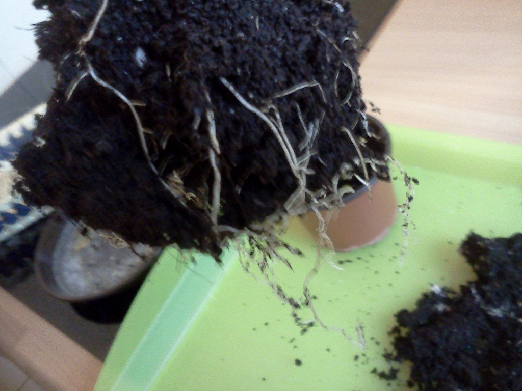 Sieht eigentlich ok aus... nix braun oder faulig...auf dem zweiten Bild ist eine weiße Stelle zu sehen-ist das im Erdgemisch gewesen oder ist das ein Schädling?? Sieht bisschen aus wie eine Woll bzw schmierlaus... Ich kanns leidef nicht so genau erkennen... Das wurzelwerk scheint auf jeden Fall ok zu sein-zu nass wirkt es auch nicht....versuchs mit drm Tonpott...ansonsten fällt mir jetzt leider ailuvh nichts mehr ein...
