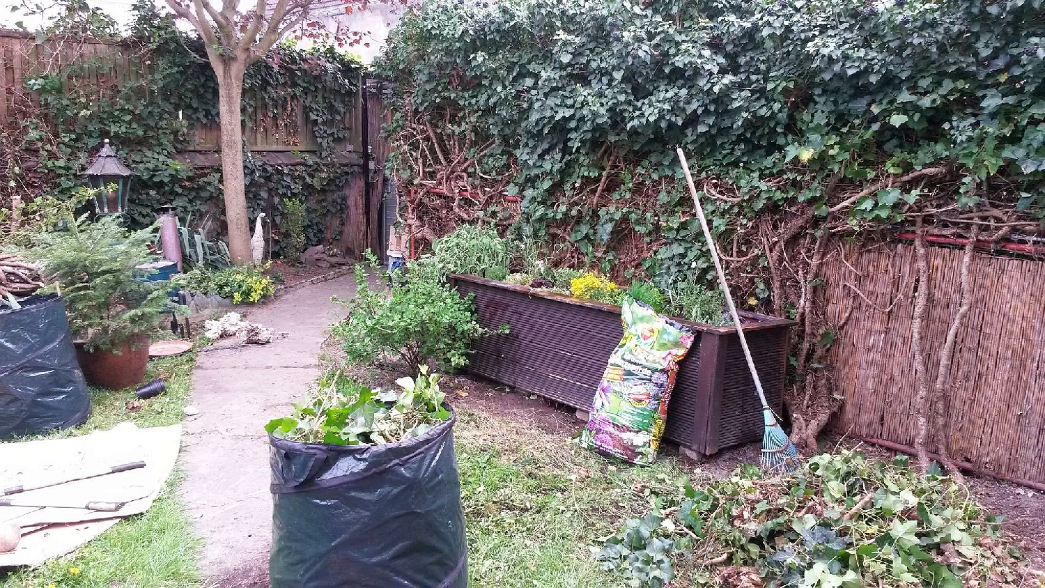 ich wollte sie rechts an die Reetmatte setzen, sie muss ja eh erst mal hoch wachsen. Das Efeu oben mache ich gerne weg - wenn ich einen Ersatz habe. Dahinter ist direkt der Nachbargarten. Ich habe jetzt schon wieder viel mehr weggemacht, der Zaun war etwa einen Meter "dick". *urgs*