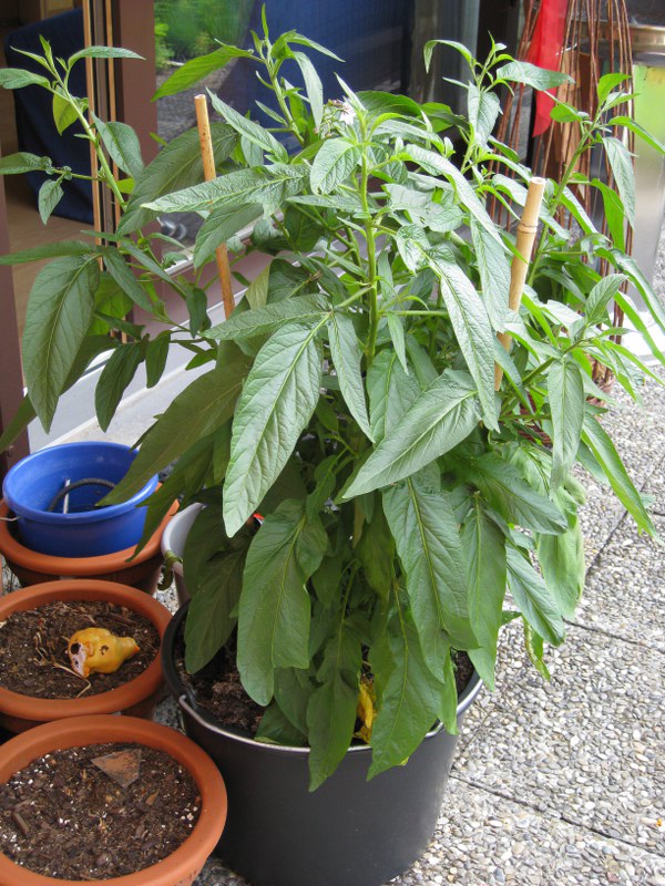 Aus dem kleinen Minipflänzchen ist eine sehr große buschige Pflanze geworden. Blüten hat sie auch gebildet, geblüht haben einige davon auch schon, aber ein paar sind auch abgefallen.