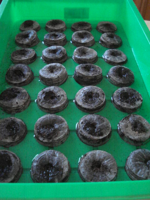 dafür benutze ich die zimmergewächshäuser. in die aussparungen passen bei mir 28 torfquelltöpfchen hinein. nach dem quellen wird jedes töpfchen mit einem samenkorn besetzt. bei der aussaat in erde ziehe ich 3-4 rillen und bringe dort das saatgut ein, ohne es mit erde zu bedecken.