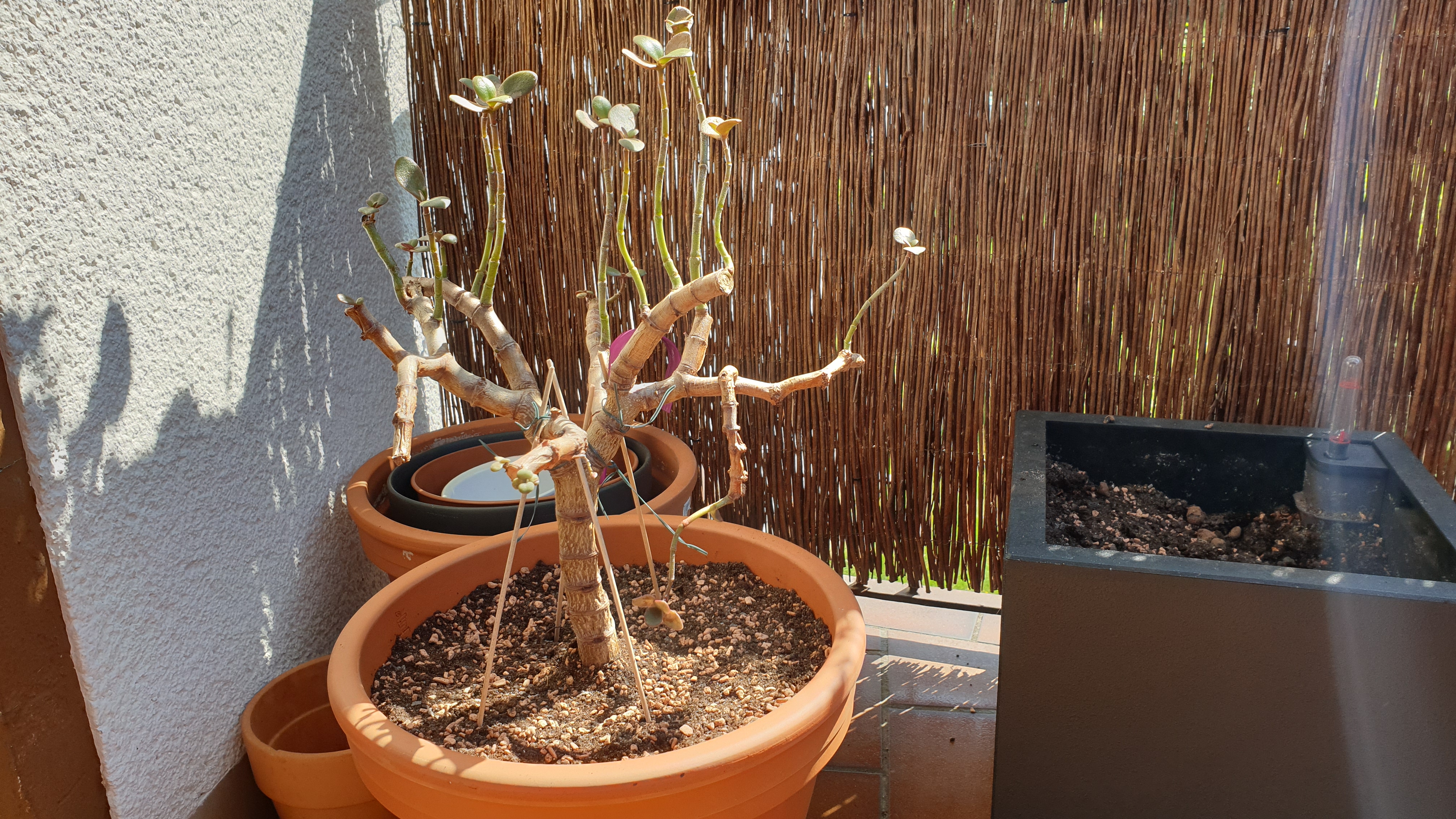Das Abstützen dient eig. eher der Tatsache, dass der Baum ja durch das Umtopfen nicht so richtig Halt hat. Dadurch das die Erde direkt aus dem Sack genommen wurde ist sie ja rel. trocken und wurde nur leicht angedrückt. Damit der Baum bei Berührung des Topfs nicht gleich umfällt (der Wurzelballen ist ja leider rel. klein) hab ich ihn so abgestützt. Sorgen macht mir echt, dass der Stamm halt nicht mehr im Durchmesser rund und fest ist sondern eben wie "eingeschrumpelt" und etwas weicher als vorher... Gleichzeitig treibt der Baum ja aber noch aus?