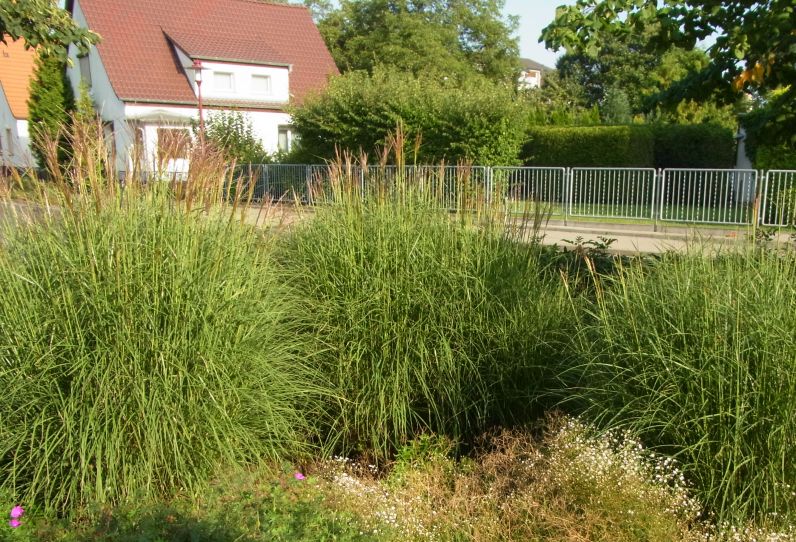 Ich konnte bisher noch kein Foto machen aber ich fahre jeden Tag an der Kreuzung vorbei und die ist mit etwas bepflanzt das so aussieht wie Schilf, aber viel kleiner, ca. 1m hoch und grasgrün.