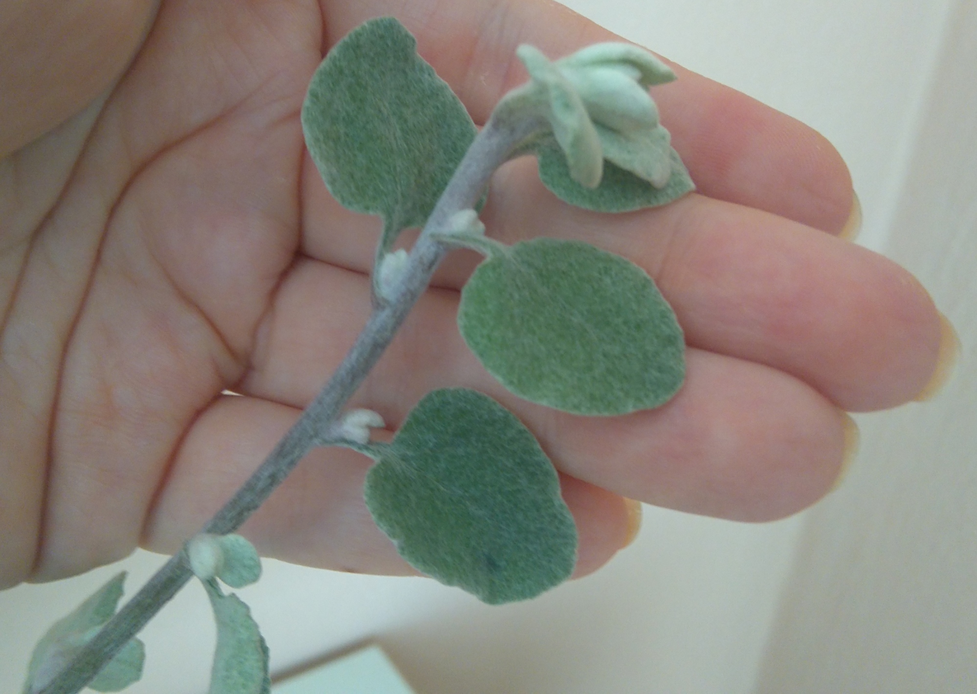 Die Pflanze hat silbrig-grüne Blätter mit einem weichen Flaum drauf. Ich glaube es sind dünne enganliegende Härchen oder so! Auch der Stiel/Stengel ist behaart. Die Planze war soetwas wie ein Bodendecker, sie hat lange Ausläufer gebildet.