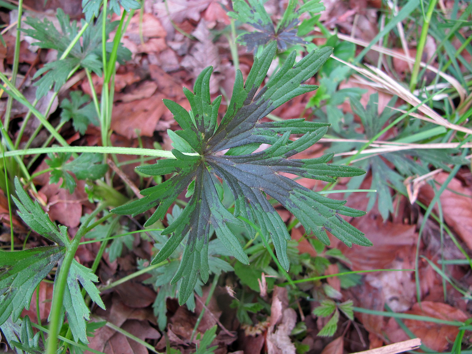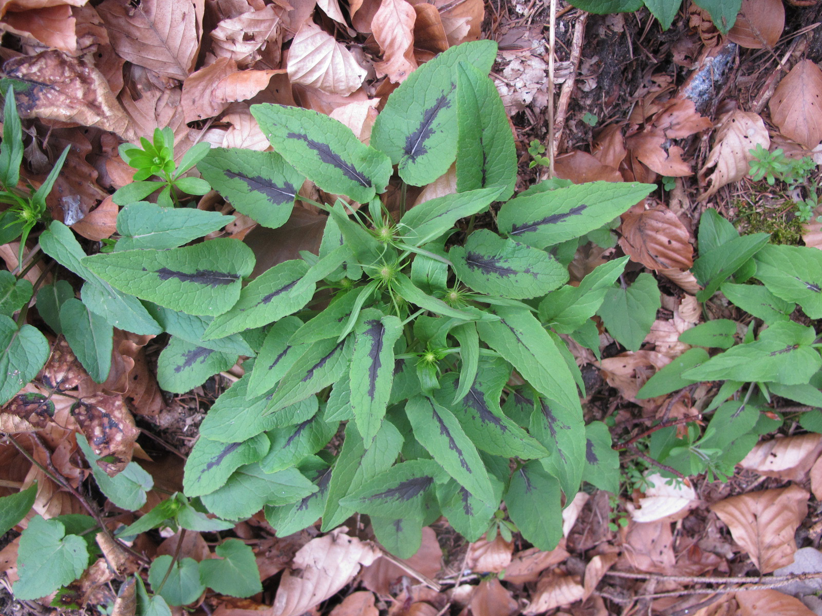 Vor einiger Zeit ist mir im Schatten eines Hohlweges auf Molasseboden eine Pflanze mit merkwürdiger dunkler Blattzeichnung aufgefallen (s. Bild). Zunächst wollte ich bis zur Blütezeit abwarten, um sie bestimmen zu können. Nun kann ich sie aber an derselben Stelle nicht wiederfinden. Vielleicht ist sie Wildfraß zum Opfer gefallen. Was könnte es wohl gewesen sein?