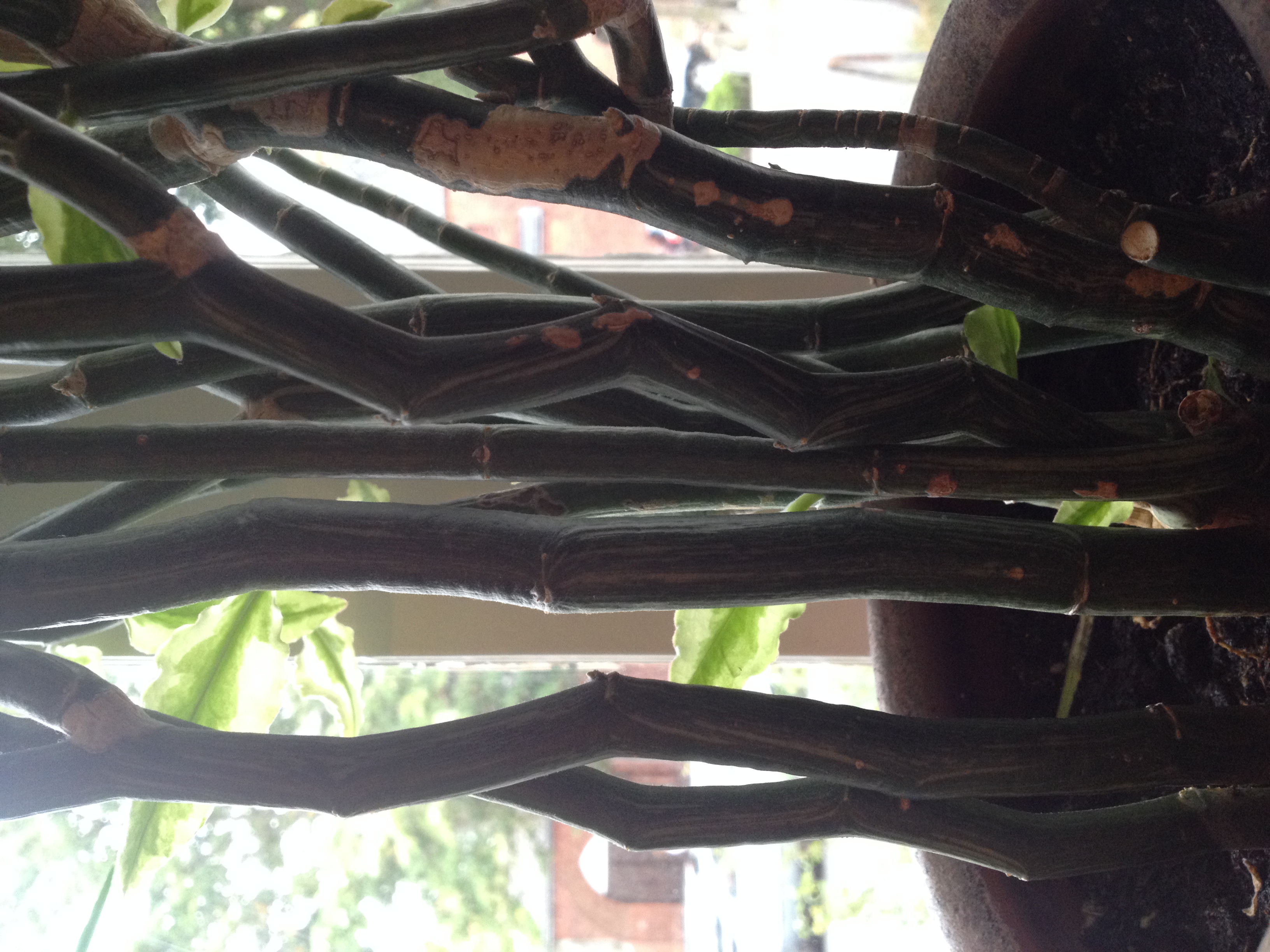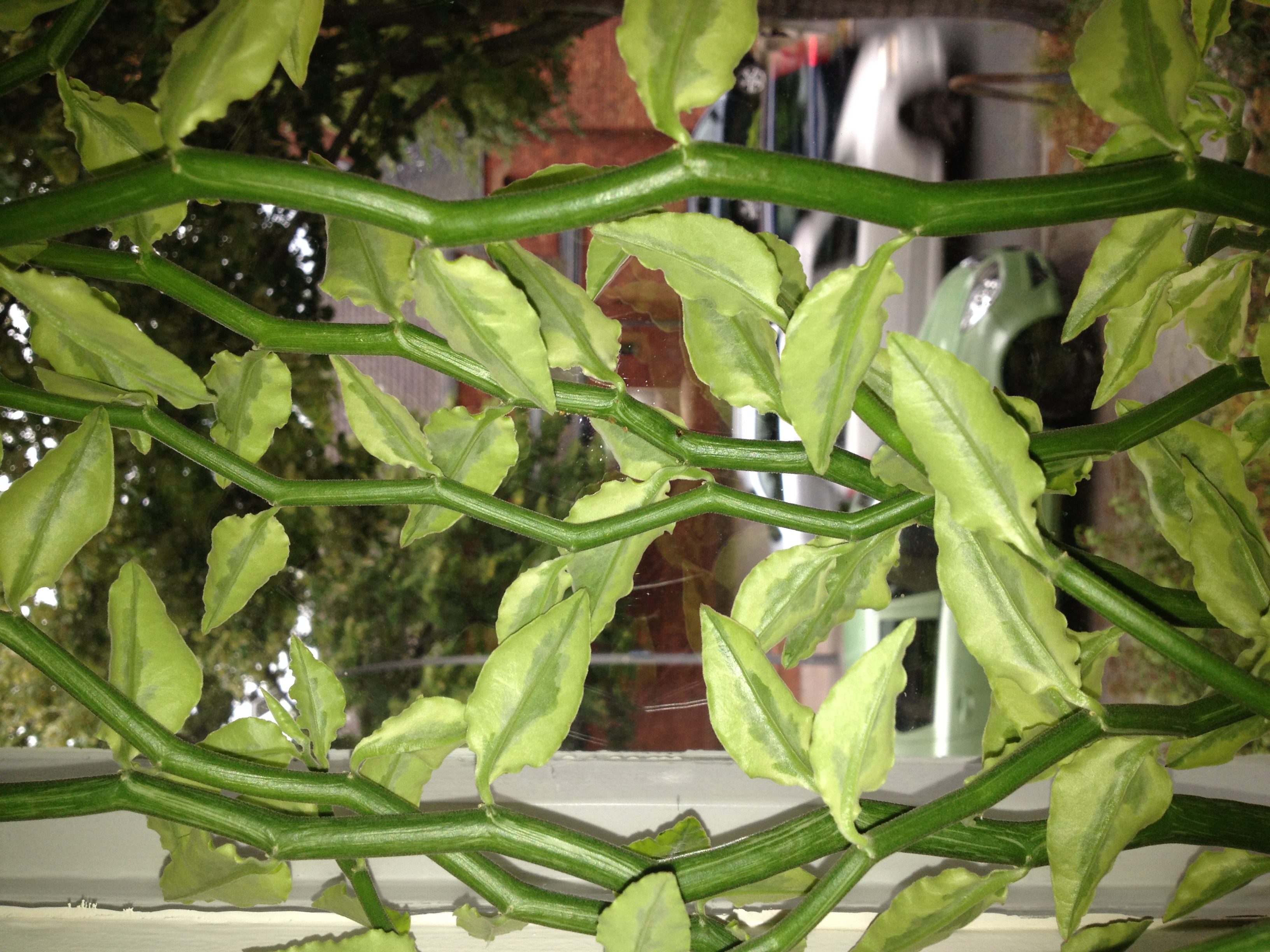 Wer kann mir bei der Bestimmung dieser Pflanzenart weiterhelfen? Es handelt sich um eine Pflanze die sich zu einer Strauchform entwickelt. Ich habe mir einen Ableger aus einem Urlaub von den französischen Antillen (Guadeloupe) mitgenommen. Unter starker Sonneneinstrahlung färben sich ihre Blätter rosa/gelblich. Diese Art wird auch gerne von Einheimischen zur Gartengestaltung genutzt.