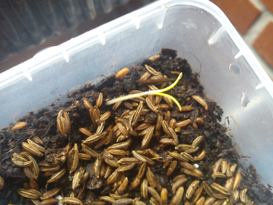 Als am 5.Tag immernoch nichts passierte, bin ich abends auf Dunkelkeimung gegangen und habe die Samen leicht mit Blumenerde "bestreut". Und, siehe da............