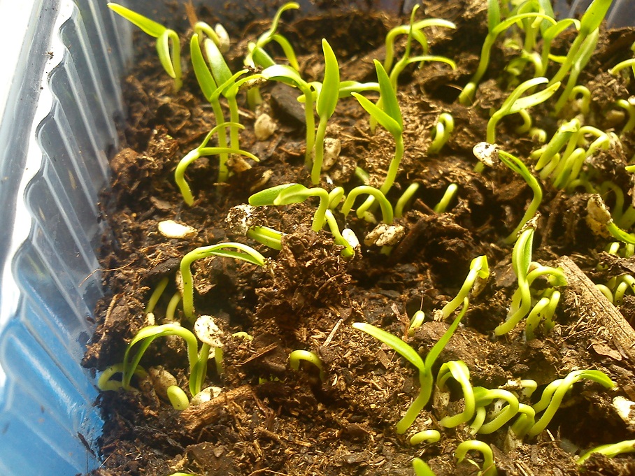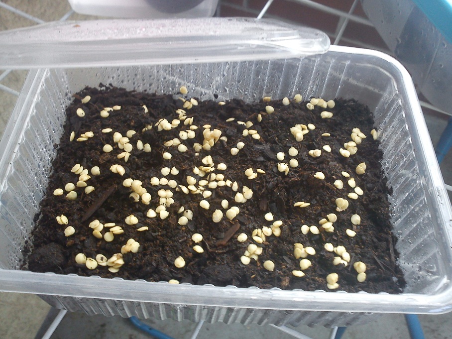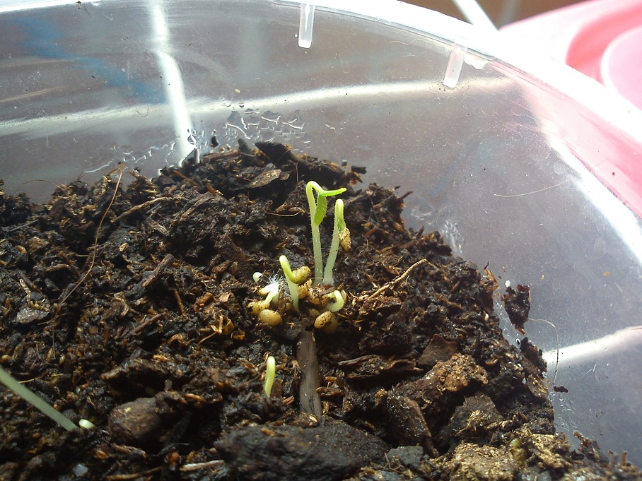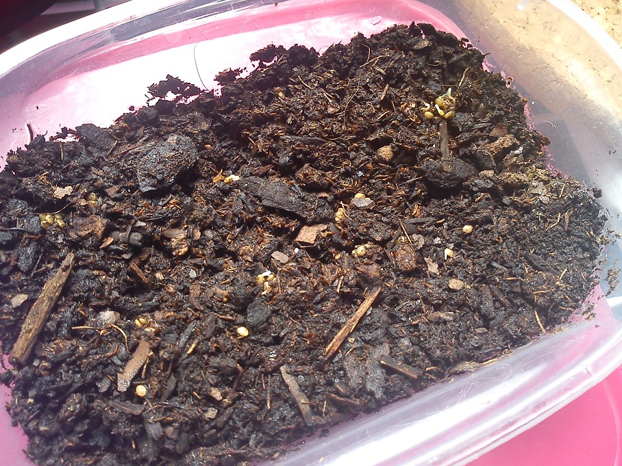 Als am 5.Tag immernoch nichts passierte, bin ich abends auf Dunkelkeimung gegangen und habe die Samen leicht mit Blumenerde "bestreut". Und, siehe da............