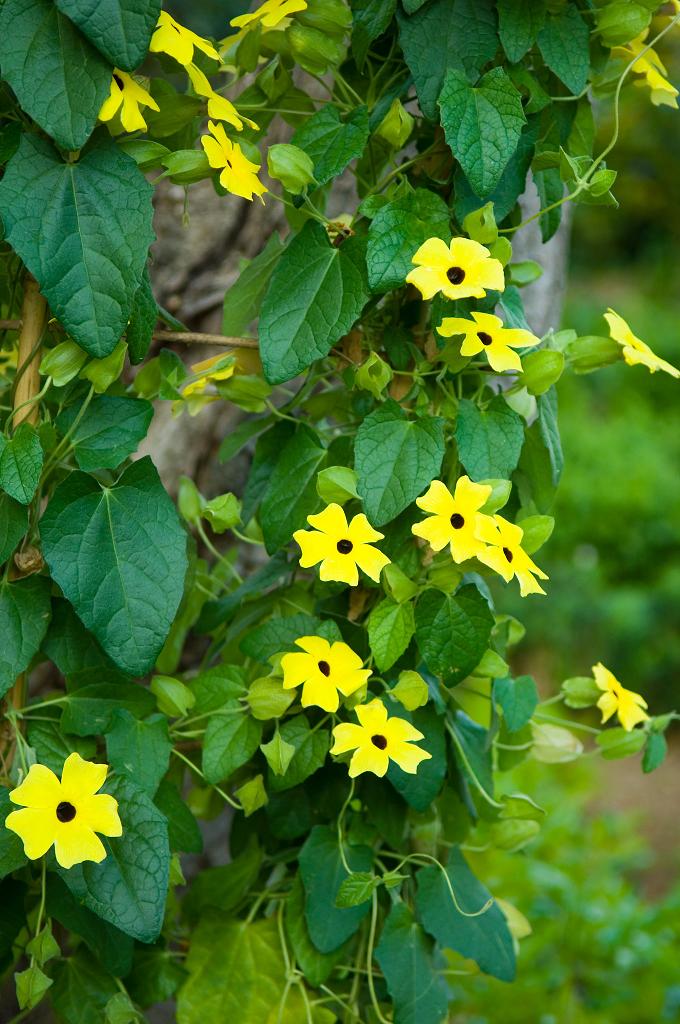 Um den begrenzten Raum auf Balkon und Terrasse effizienter nutzen zu können, bieten sich Kletterpflanzen an. Sie nehmen wenig Platz in Anspruch, da sie an Rankhilfen in die Höhe wachsen und kaum breit werden. Die einjährige Schwarzäugige Susanne (Thunbergia) und viele Waldreben-Sorten (Clematis) eignen sich hier besonders wegen ihrer Wuchsstärke und Höhe. Im Kübel werden sie ca. 1,5 bis 2 Meter groß und blühen von Juni bis September.