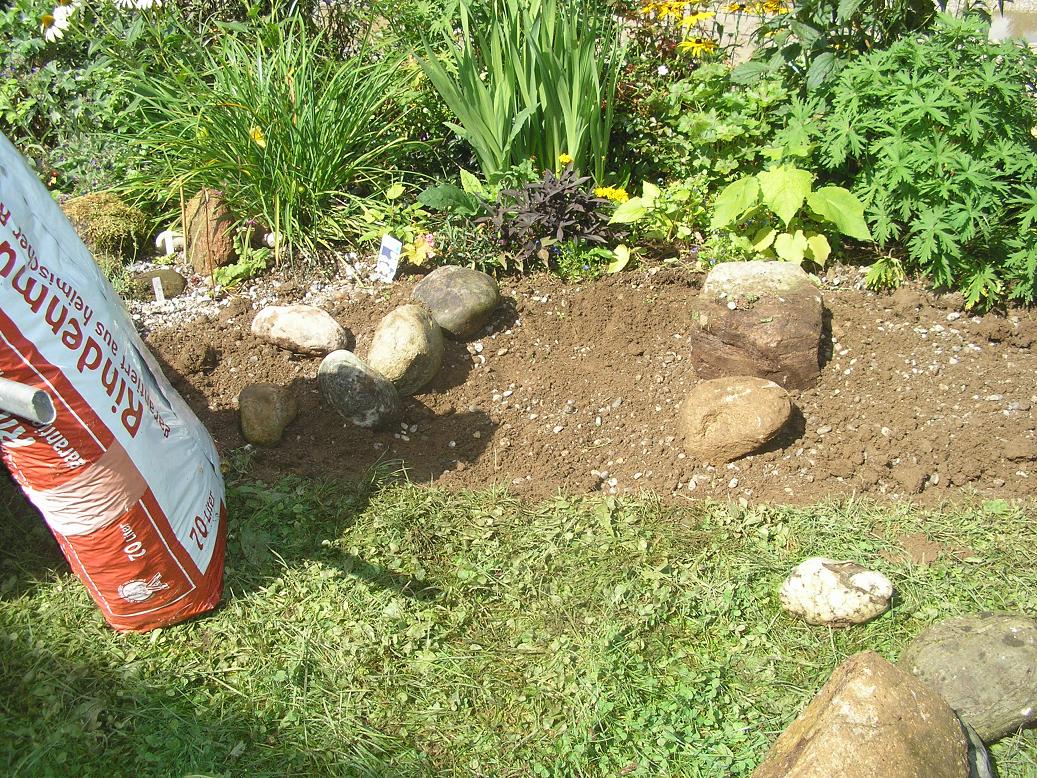 Nach dem Weg habe ich dann noch mal eine Schubkarre voller Sand und Kies herangekarrt und mit diesem material dann die oberste Schicht des Steingartens abgedeckt und das ganze dann nur grob mit der Erde gemischt. (Unten drinnen ist ja genug Erde) Außerdem kommen nun die ganzen Steine an die Reihe die alle eingebaut werden müssen, in kleinen oder größeren Gruppen, wie man will.