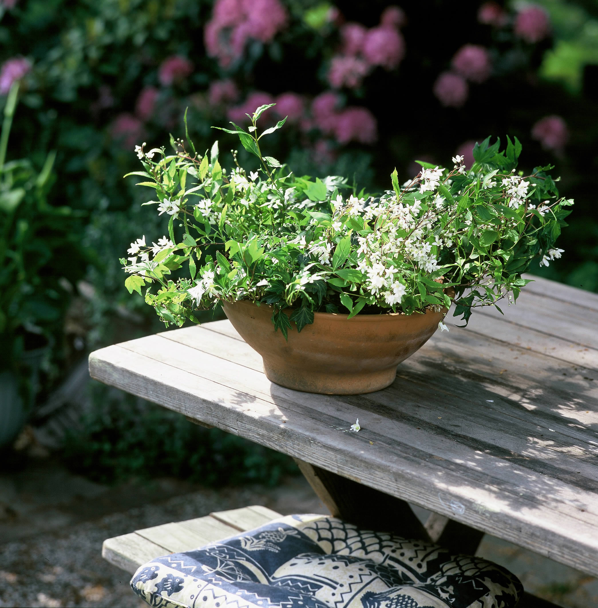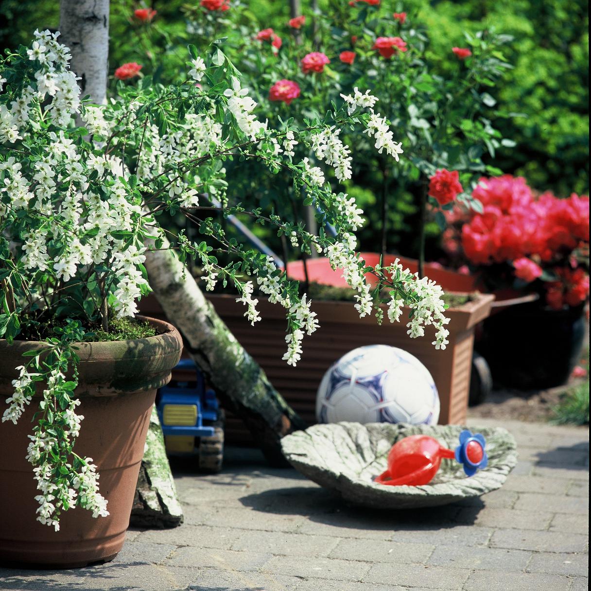 Der Mai ist eine gute Zeit, um in Gartencentern, Baumschulen und Staudengärtnereien auf Entdeckungsreise zu gehen. Das Frühlingswetter und die wiedererwachte Natur locken nach draußen und es macht jetzt noch mehr Spaß als in der kalten Jahreszeit, im Garten aktiv zu werden und zu pflanzen. Bäume und Sträucher zeigen sich in frischem Grün, Maiglöckchen, Flieder und Pfingstrosen blühen und auch weniger bekannte Gehölze öffnen ihre Blüten. Eines davon ist die Reichblühende Prunkspiere (Exochorda ’The Bride’), eine zierliche, blühfreudige Schönheit, die nur etwa 1,5 Meter hoch wird. Sie kann gut in Beete, kleinere Gärten und auch in Kübel gepflanzt werden. Für die Vase geschnitten, bringen ihre Blütenzweige frühlingshafte Stimmung ins Haus. Die Prunkspiere ist im Mai von einem duftigen Schleier reinweißer Blüten überzogen wie eine Braut in ihrem Hochzeitskleid. Mit den strahlend weißen Blüten kommt sie besonders vor einem dunklen Hintergrund gut zur Geltung. Sie passt ausgezeichnet zu blau blühenden Pflanzen oder in einen Garten, in dem Weiß und silbrige Grautöne das Bild bestimmen. Die Blüten haben einen Durchmesser von etwa 3 bis 4,5 Zentimeter und sind im Vergleich zu denen anderer Prunkspieren relativ groß.