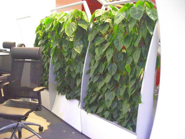 Es bedarf keines baulichen Aufwands, um bestehende Großraumbüros in angenehme Arbeitsplätze umzuwandeln. Einfach geht das mit großen Pflanzen. Zwei oder drei Schreibtische zu einer Arbeitsinsel zusammengefasst und mit großen Zimmerpflanzen oder mobilen begrünten Wänden zu den angrenzenden Inseln abgeschirmt, schafft sofort eine angenehme Arbeitsatmosphäre. Die Mitarbeiter werden entspannter und konzentrierter arbeiten, weil sie das Grün wohl und geborgen fühlen lässt. Neben diesem psychologischen Effekt werden gleichzeitig die Probleme mit dem Lärm und der trockenen Luft reduziert. Pflanzen schlucken Geräusche und sorgen für einen erträglichen Geräuschpegel am Arbeitsplatz. Dabei gilt: Je größer die Blätter der Pflanze bzw. je dichter das Grün ist, desto effizienter wird der Lärm absorbiert. Die Luft aus Klimaanlagen enthält häufig wenig Feuchtigkeit, so dass die Augen der Mitarbeiter schnell trocken werden. Das wiederum führt zur schnellen Ermüdung der Augen und damit zu Konzentrationsschwierigkeiten. Auf Dauer können sogar Augenentzündungen ausgelöst werden. Besonders Grünpflanzen mit hohem Wasserbedarf, wie zum Beispiel Farn, Zimmerlinde und Zypergras, sind geeignet, die Luftfeuchtigkeit im Büro auf natürliche Weise auf ein gesundes Maß zu erhöhen. Laut der Verwaltungs-Berufsgenossenschaft wird "ein begrüntes Büro von den meisten Menschen als angenehm empfunden". Angesichts der vielen positiven Wirkungen der Büropflanzen überrascht das nicht. Nur leider wird das noch viel zu wenig in der Planung von Büros berücksichtigt.