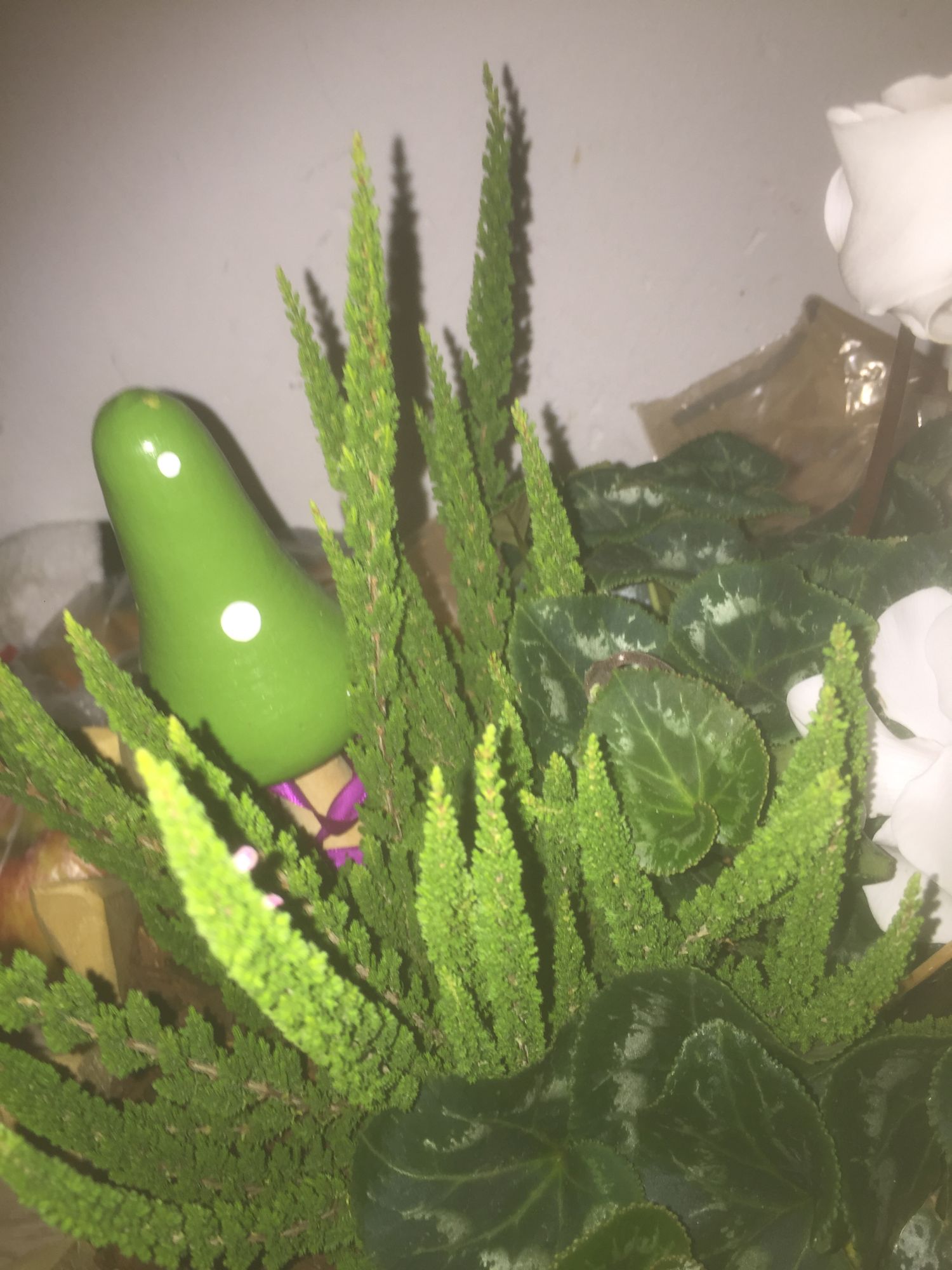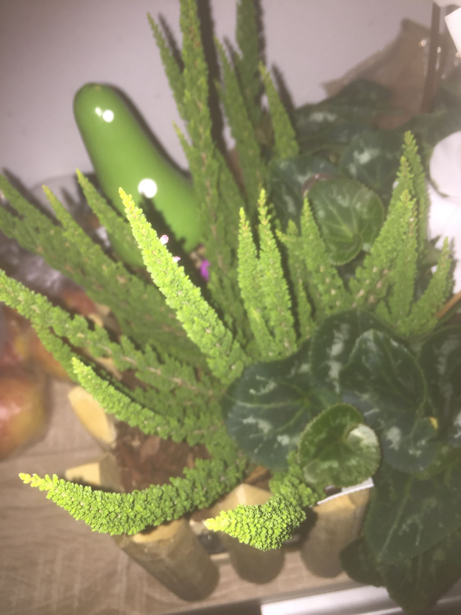 Habe kürzlich eine Pflanze entdeckt und lade zwei Bilder dieser hoch. Es ist jene Pflanze im Vordergrund, die mit Blitz beleuchtet ist, sie sieht stachelig aus, ist es aber keineswegs, habe ganze Zimmerpflanzenlexika durchstöbert, ohne etwas zu finden, leider kann ich keine Fotos dieser Pflanze mehr machen, da diese verschenkt wurde.