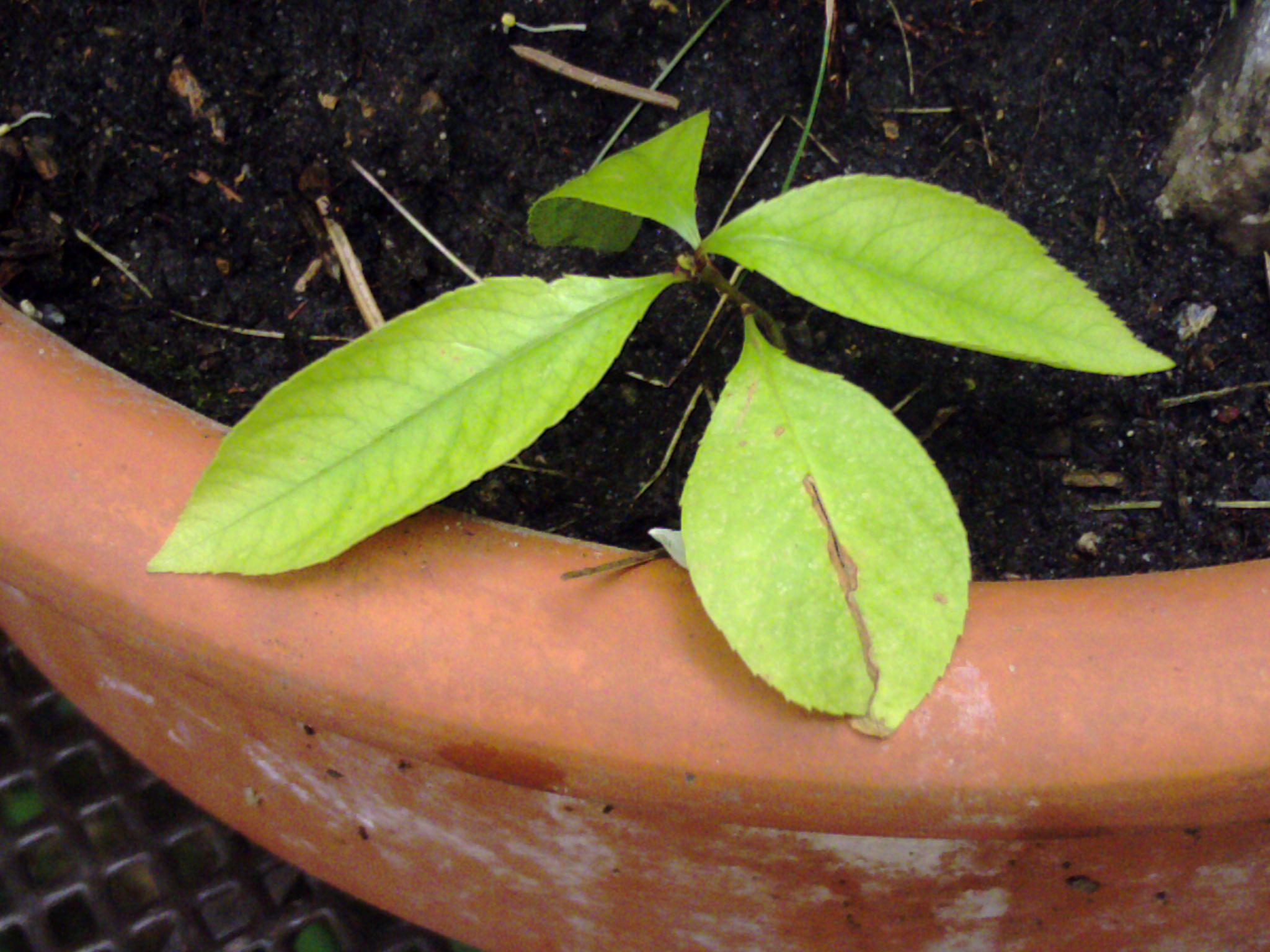 Bild 4 wächst in einem meiner Blumentöpfe=Prunussämling??