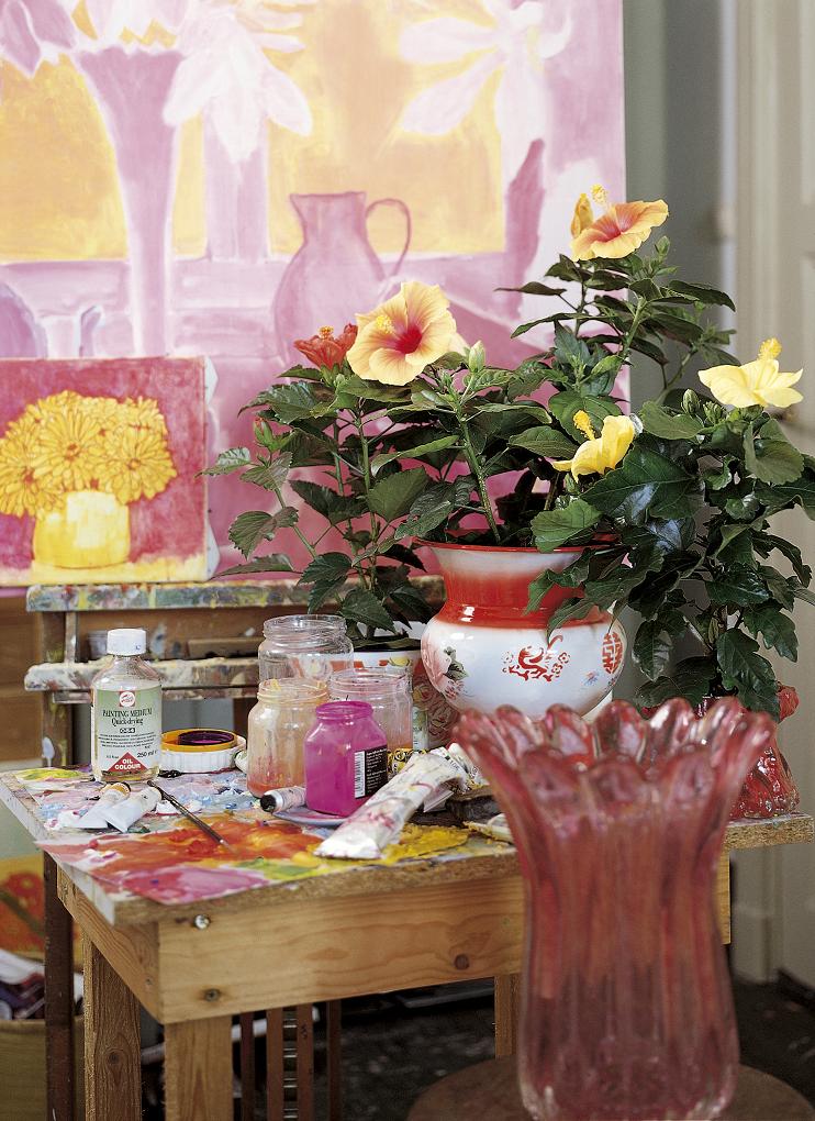 Das Faszinierendste am Hibiscus sind seine weich konturierten, sehr zart und luftig wirkenden Blüten, die in der Ursprungsform aus fünf rosenroten Blütenblättern bestehen, aus deren Mitte eine auffällige Säule ragt, die aus den zusammengewachsenen Staubfäden gebildet wird. Sie harmonieren wunderbar mit den an eigenwillig abstehenden Ästen sitzenden kräftigen, glänzend dunkelgrünen Blättern.