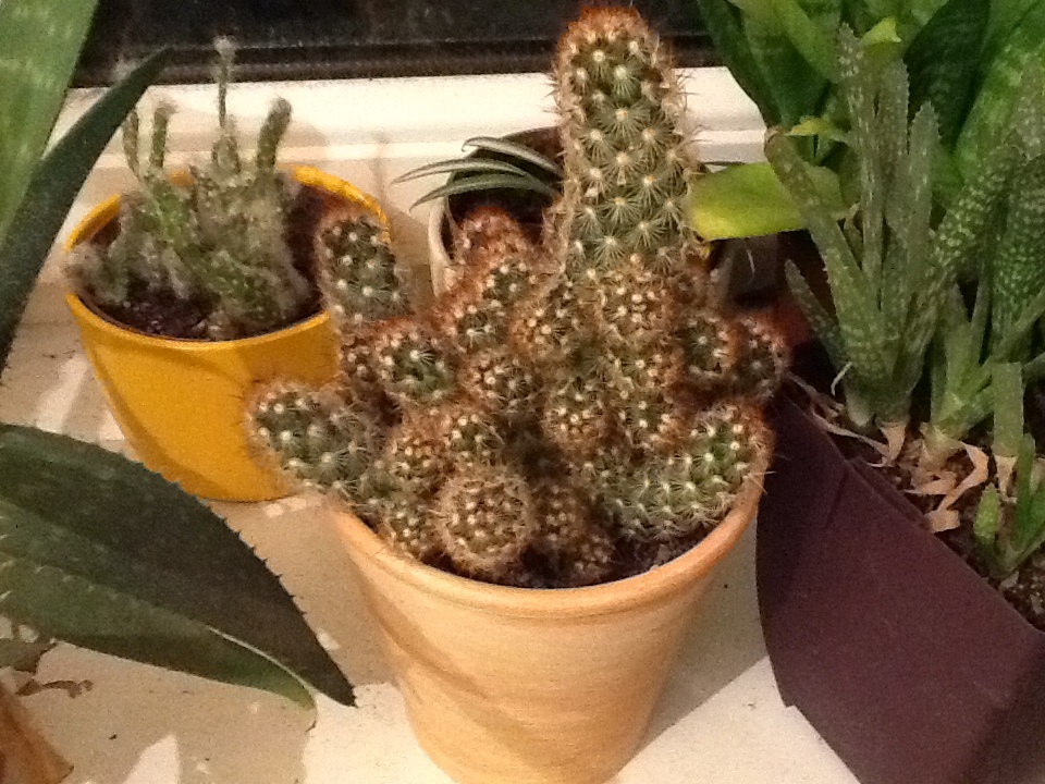 Der Kaktus ist eine Mammilaria elongata, und die beiden Pflanzen auf den Bildern darunter und darüber könnten evtl. Aloen sein.