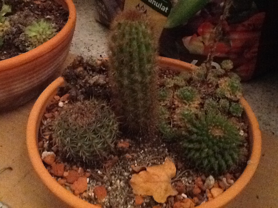 In der Kakteenschale sitzt mindestens eine Mammillaria (unten rechts); bei den beiden anderen möchte ich mich nicht festlegen, das ist oft schwierig bei Kakteen, v. a. ohne Blüten.