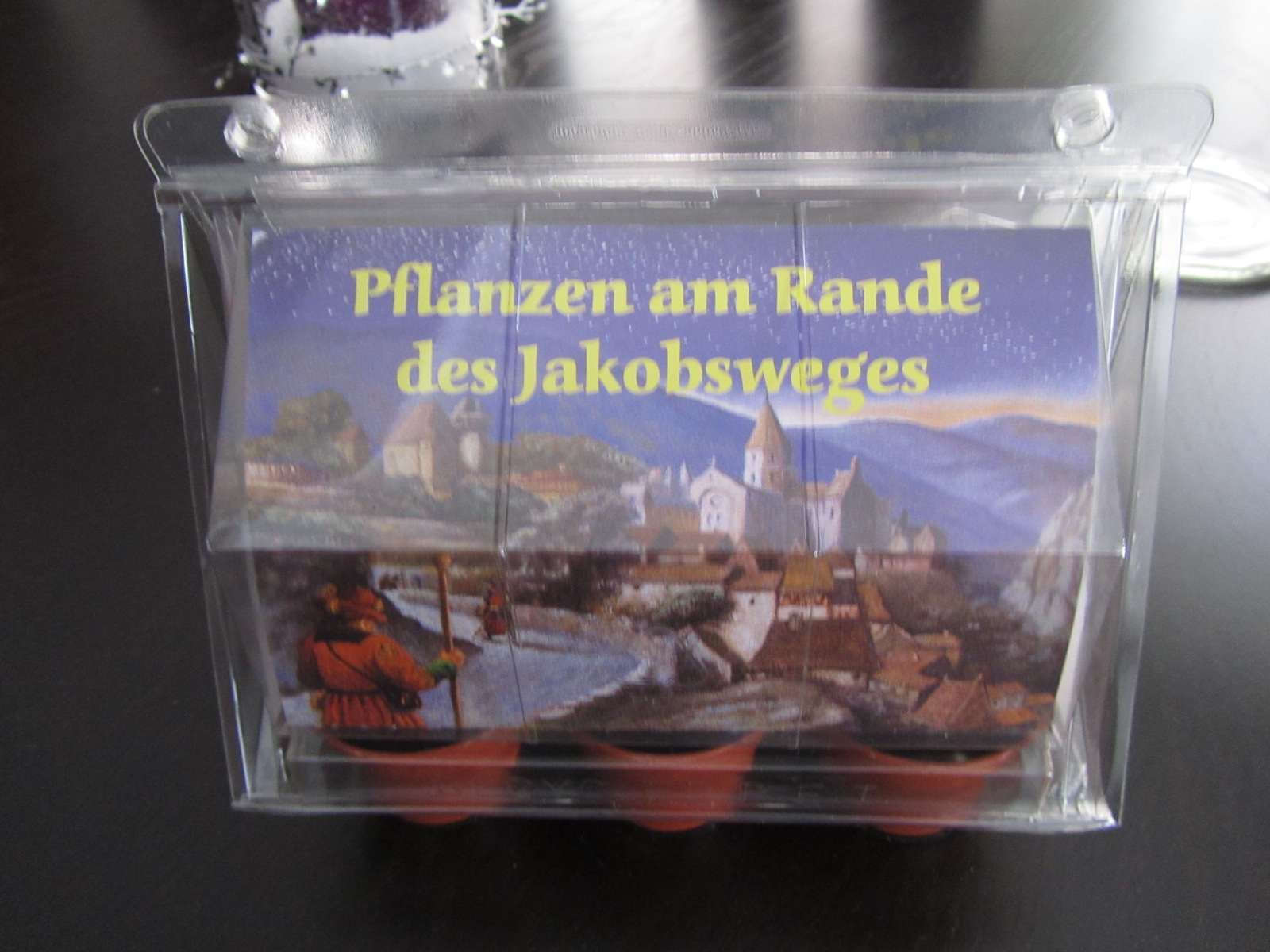 Da mein GG sich vorgenommen hat, jedes Jahr einen weiteren Teilabschnitt des Jakobsweges mit dem Fahrrad zu erpilgern, bekam er vom schwägerlichen Christkind die unten abgebildeten Pflanzensamen incl. Equipment.