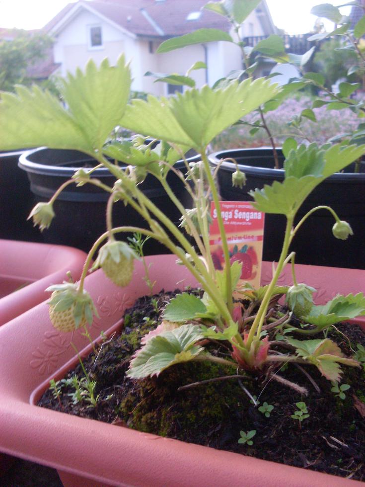 - die Erdbeeren blühen immer noch fleißigst, sind aber noch meilenweit von Frucht entfernt