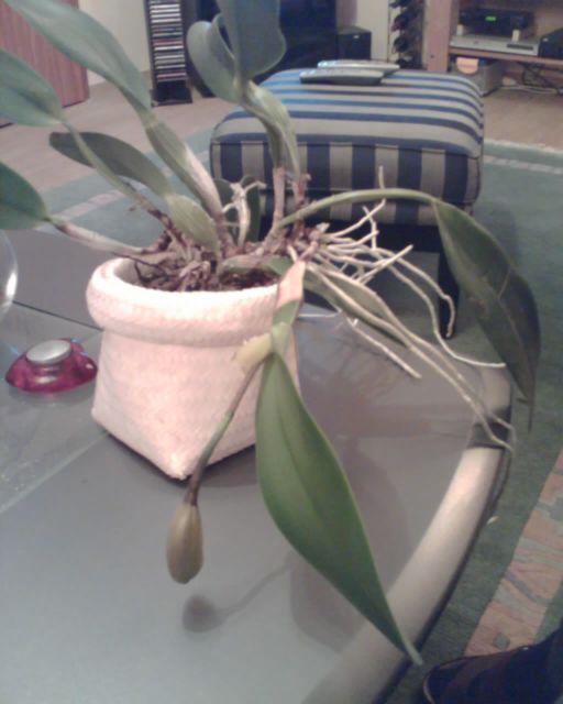 du solltest den Trieb mit der Knospe senkrecht stellen und mit einem Stab stützen.du wirst sonst nicht viel von der Blüte sehen.Ausserdem muss die Pflanze unbedingt Umgetopft werden.Dies aber erst nach der Blüte.Wie man sieht sind die Letzten Triebe sehr schwach was auf mangelnde Nährstoff versorgung hinweist.Wetere Pflegetips folgen.dazu muss ich aber erst dein Foto ein wenig bearbeiten.