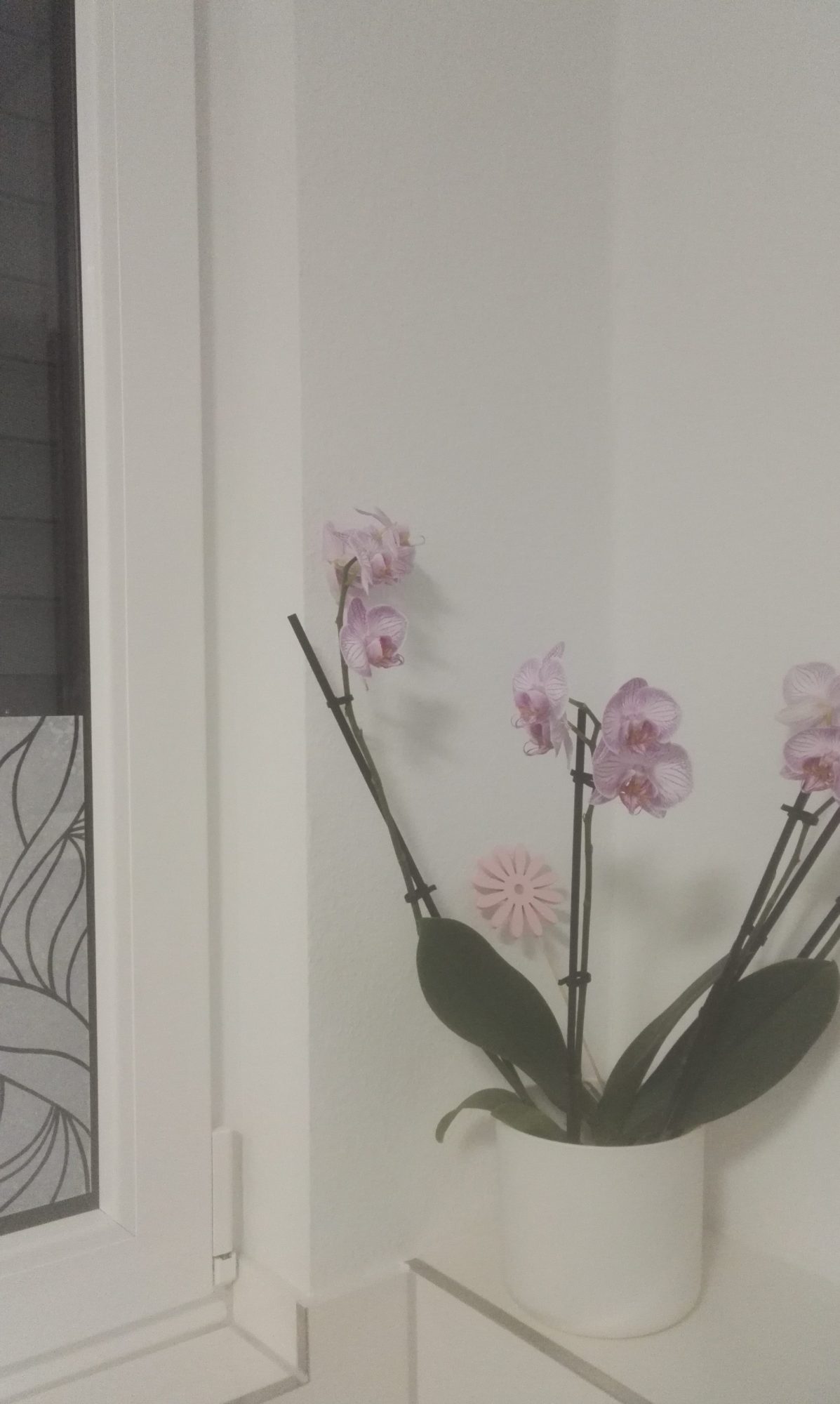 vor einigen Wochen bekam ich diese schöne Orchidee. Sie stand zunächst ein paar Tage auf meiner Fensterbank in der Küche, doch da das Fenster im Süden liegt und sie nicht der Mittagssonne ausgesetzt sein sollte, stellte ich sie ins Bad. Dort ist die Fensterbank zu schmal, deswegen steht sie daneben auf der Ablage. Ich hoffe, sie bekommt genug Licht, obwohl das Fenster gegen Osten geht, sie ca 50 cm vom Fenster entfernt steht und der untere Teil des Fensters mit Sichtschutzfolie beklebt ist.