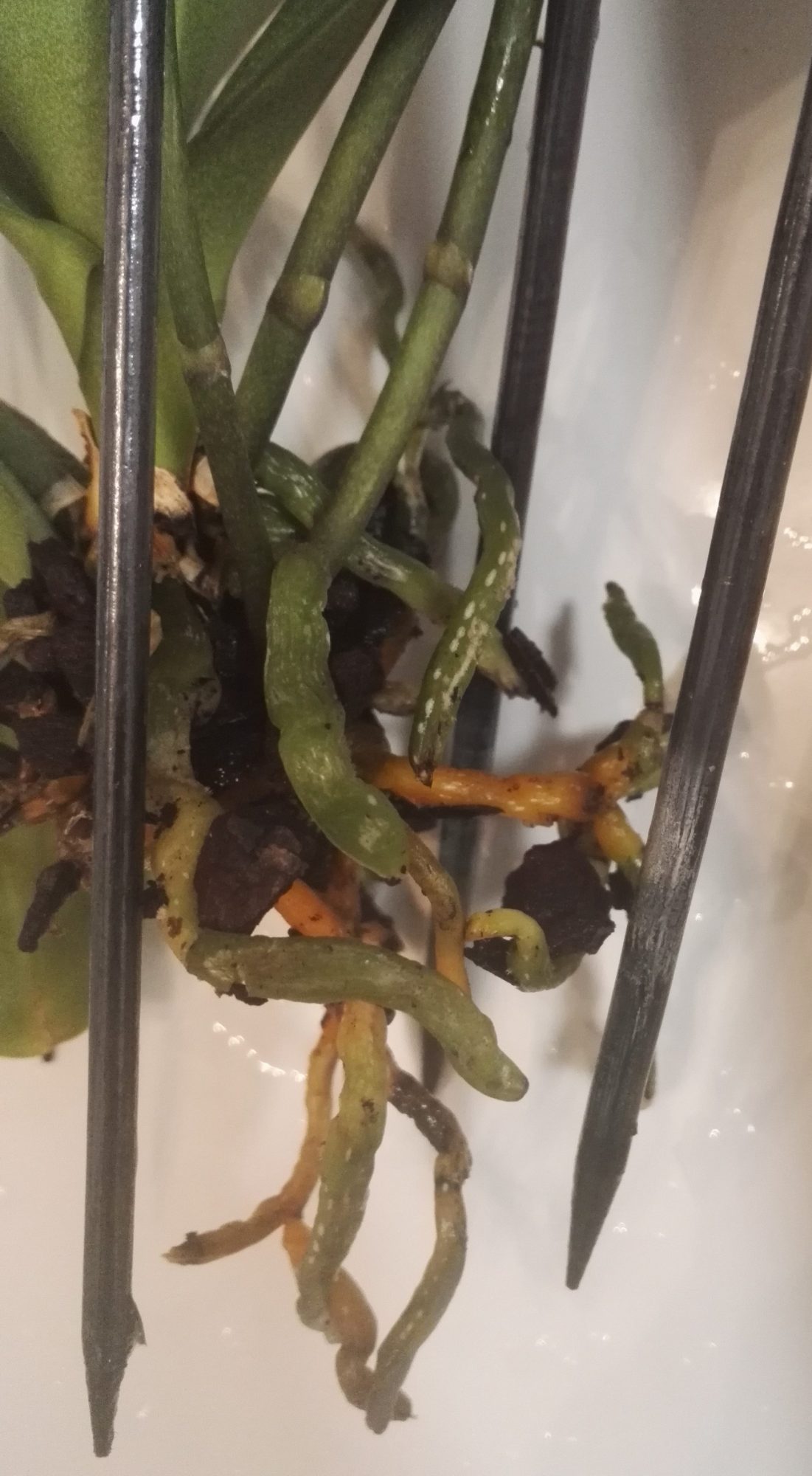 vor einigen Wochen bekam ich diese schöne Orchidee. Sie stand zunächst ein paar Tage auf meiner Fensterbank in der Küche, doch da das Fenster im Süden liegt und sie nicht der Mittagssonne ausgesetzt sein sollte, stellte ich sie ins Bad. Dort ist die Fensterbank zu schmal, deswegen steht sie daneben auf der Ablage. Ich hoffe, sie bekommt genug Licht, obwohl das Fenster gegen Osten geht, sie ca 50 cm vom Fenster entfernt steht und der untere Teil des Fensters mit Sichtschutzfolie beklebt ist.
