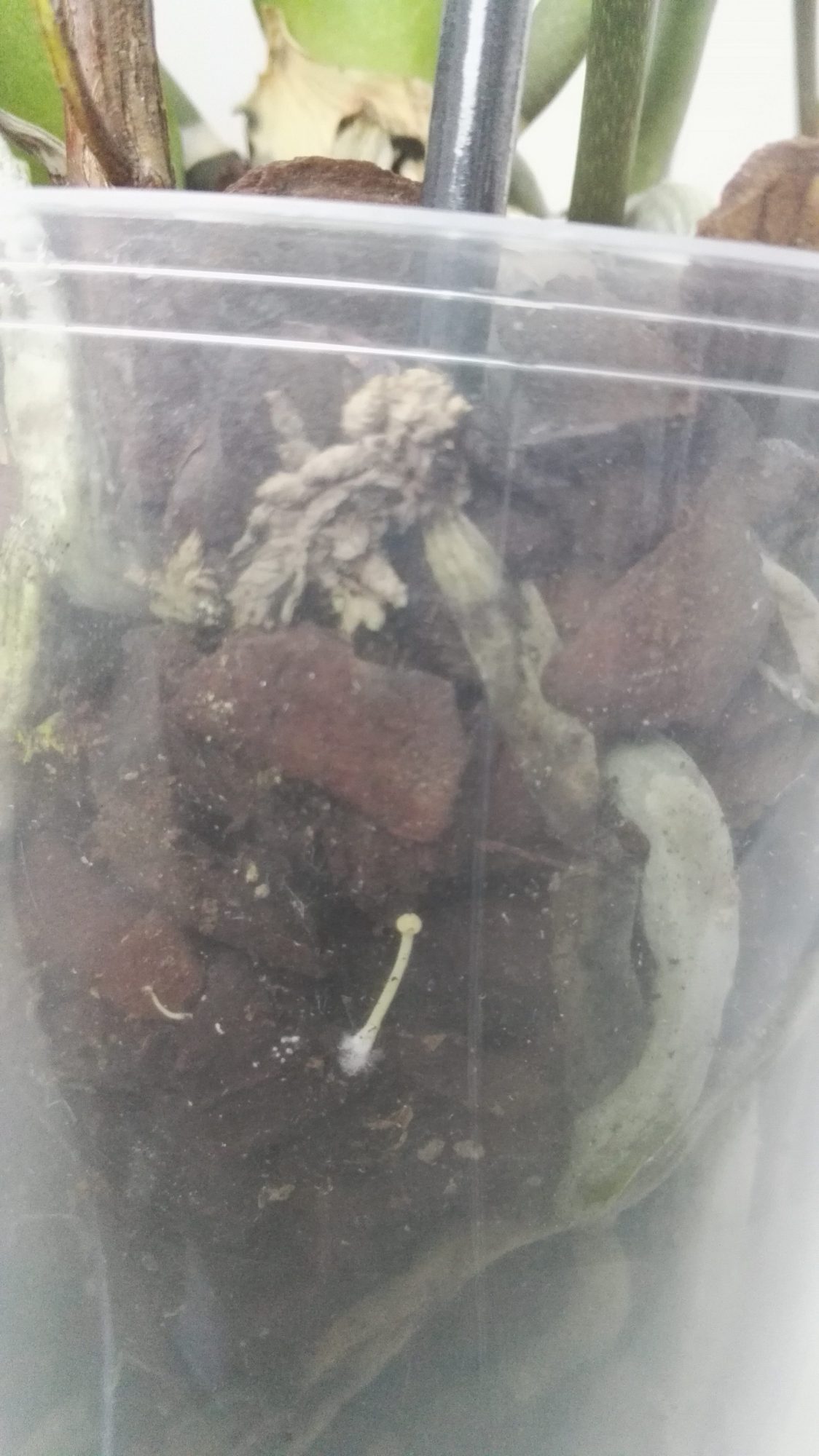 Dennoch wurde erst ein Blatt gelb, jetzt das 2., bzw entdeckte ich unter diesem noch ein kleines Blatt, dass schon abfiel. Außerdem werden durch den durchsichtigen Topf Fruchtkörper von Pilzen sichtbar!