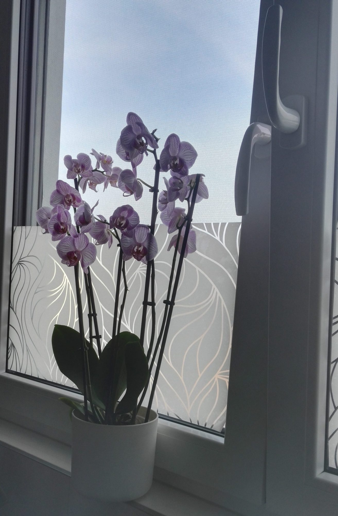 vor einigen Wochen bekam ich diese schöne Orchidee. Sie stand zunächst ein paar Tage auf meiner Fensterbank in der Küche, doch da das Fenster im Süden liegt und sie nicht der Mittagssonne ausgesetzt sein sollte, stellte ich sie ins Bad. Dort ist die Fensterbank zu schmal, deswegen steht sie daneben auf der Ablage. Ich hoffe, sie bekommt genug Licht, obwohl das Fenster gegen Osten geht, sie ca 50 cm vom Fenster entfernt steht und der untere Teil des Fensters mit Sichtschutzfolie beklebt ist.