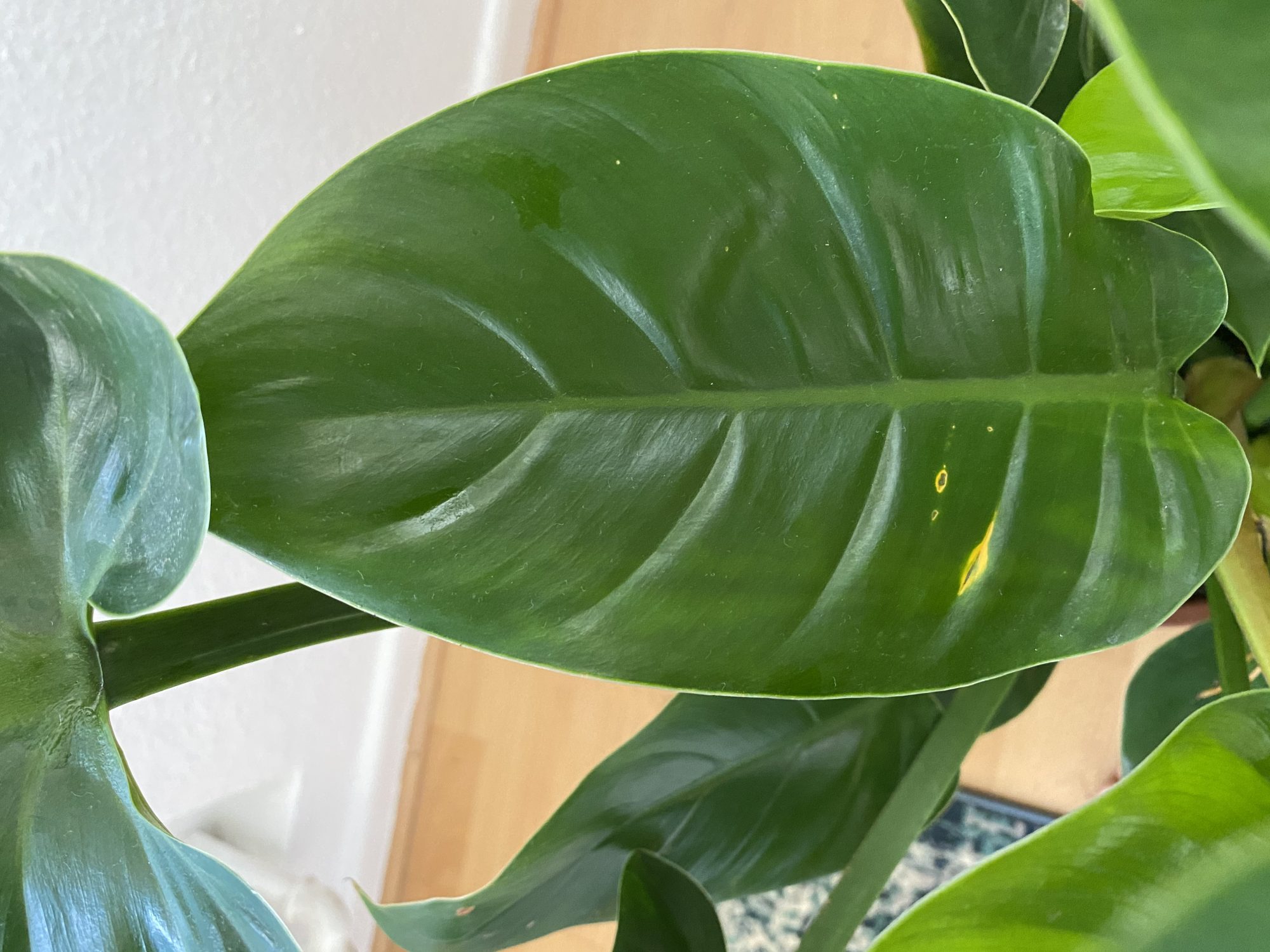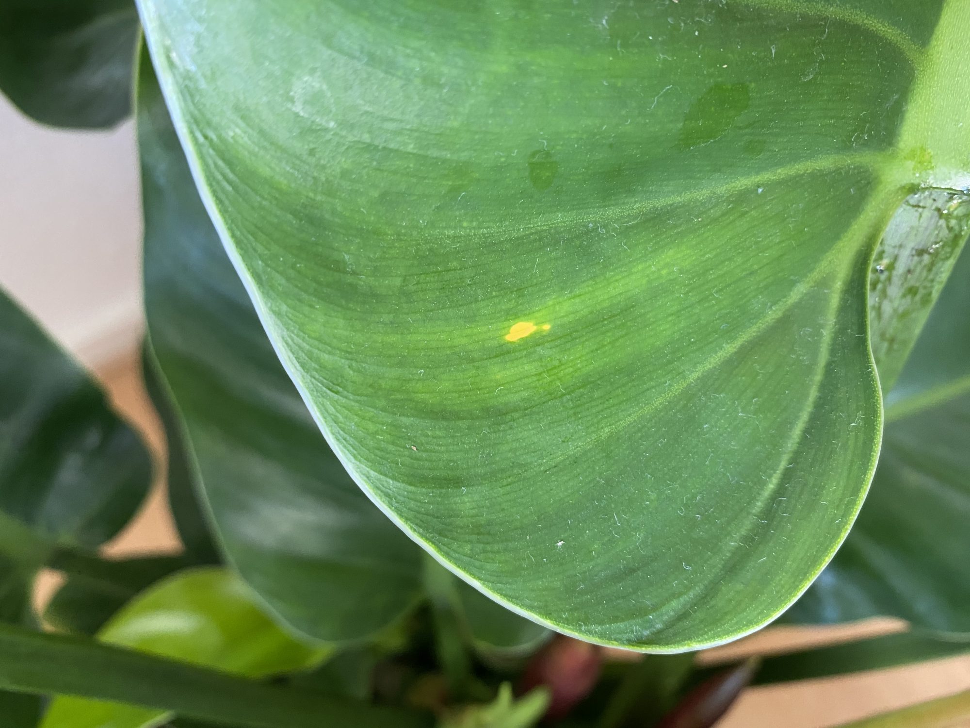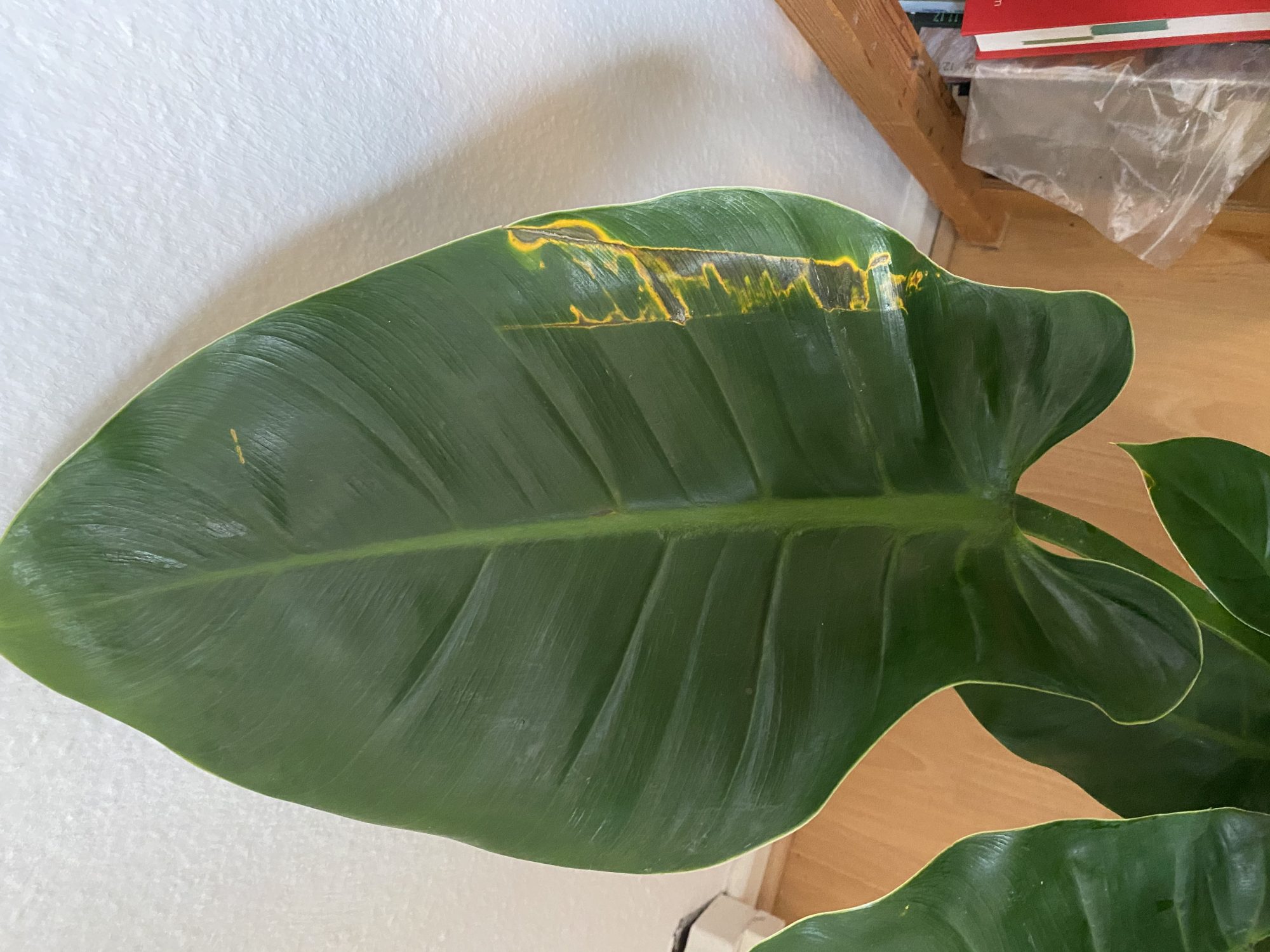 ich habe mir vor kurzem einen Philodendron Imperial Green gekauft. Dieser hatte an einem Blatt etwas, was für mich einfach nach einem mechanischem Schaden aussah. Dachte also das Blatt ist beschädigt und dadurch ein Teil abgestorben.