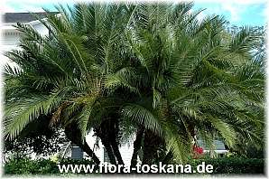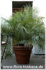 Die Zwerg-Dattelpalme (Phoenix roebelenii) ist sicher die zarteste und eleganteste unter den Dattelpalmen. Mit ihren 10-15 cm dünnen, oft zu mehreren eingepflanzten Stämmen und den schlanken, 1-1,5 m kurzen Wedeln geben sie exzellente Topfpalmen her. Zwerg-Dattelpalmen lieben sonnige Plätze, kommen aber auch an teilsonnigen bestens zurecht, ebenso wie mit einem Dauerplatz unter Glas oder in großen, hellen Wohn- oder Büroräumen. Wen die für alle Dattelpalmen typischen, Stacheln im unteren Bereich der Blattstiele stören, der kann sie einmal mit einer Gartenschere abkneifen.