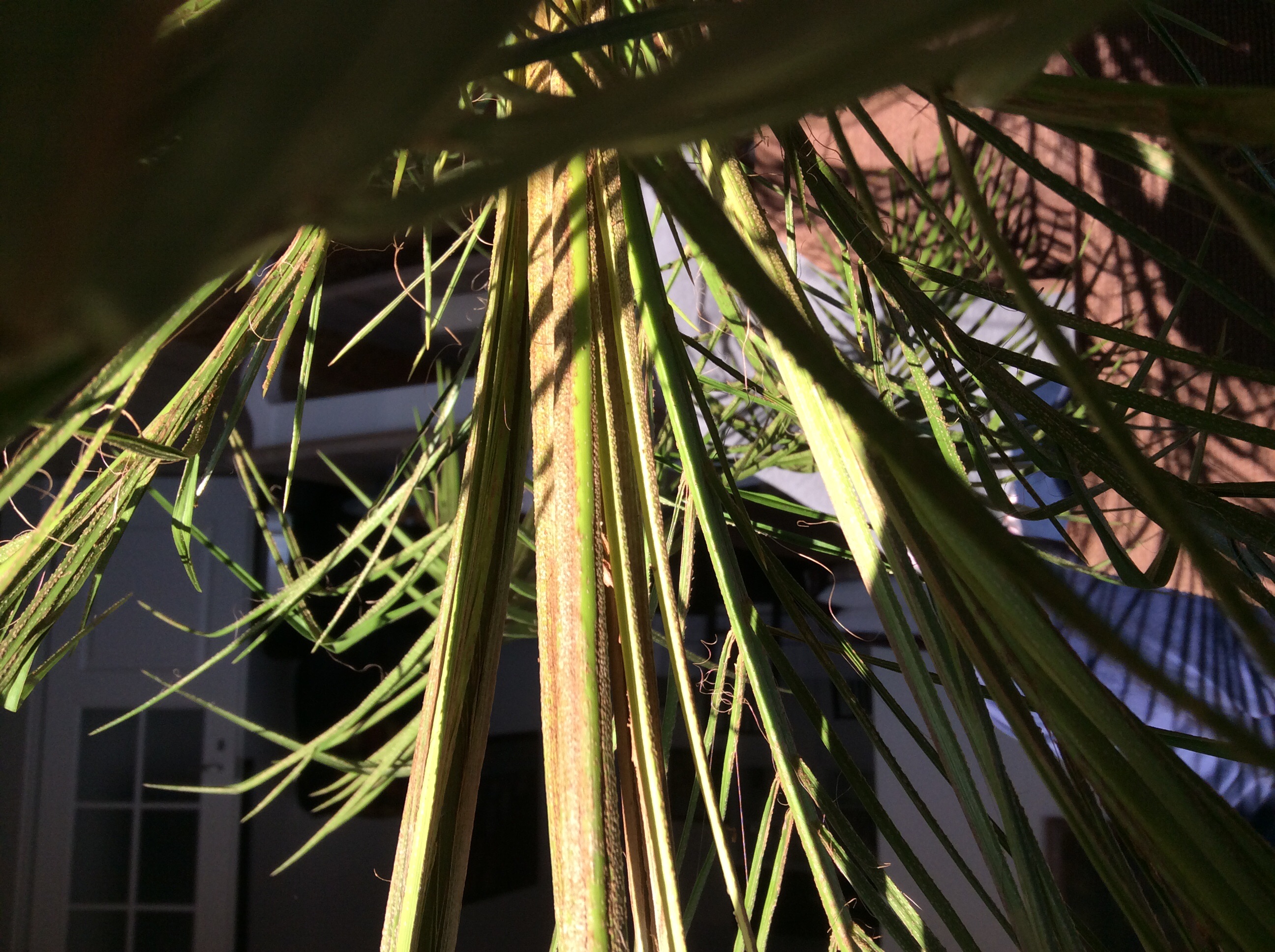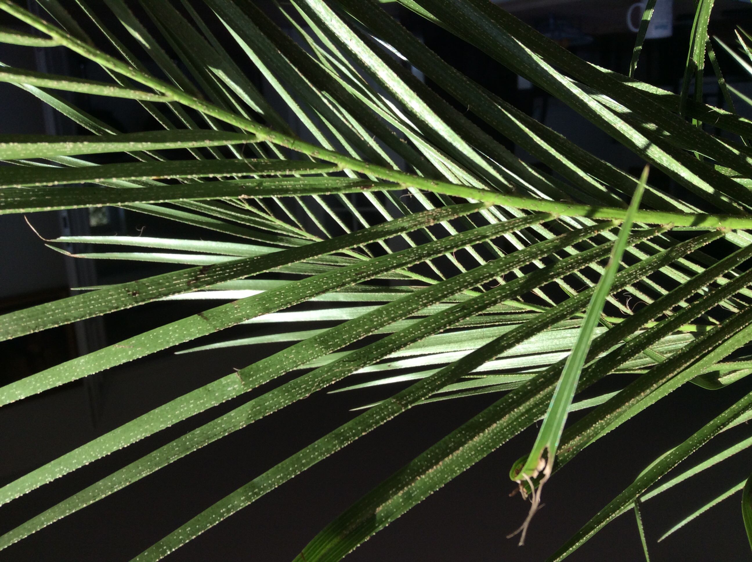 ich habe eine Phoenix Roebelinii gekauft vor ca. 2 Wochen im Toom und sie sah prächtig aus. Wir haben sie zuerst in den Flur gestellt, wo sie zwar einiges an Licht bekommt, aber kein direktes Sonnenlicht. In letzter Zeit war es sehr dießig drausen und daher vermute ich, dass die Pflanze weniger Licht bekommen hat, als sie gebraucht hätte. Nun hängt sie durch, wirkt kraftlos, die spitzen Blätter knicken zum Teil nach unten und ich weiß nicht genau, aber mir kommt sie etwas brauner vor in der Mitte, wo die neuen Blätter nachwachsen. Außerdem weiß ich nicht, ob vorher schon so viele braune Punkte an der Unterseite der Blätter waren.