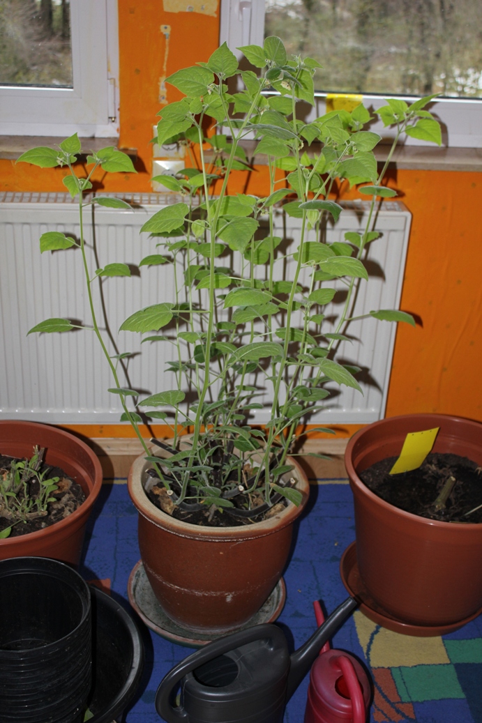 ich habe Ende Oktober meine Physalis zurück auf ca 10-15cm zurück geschnitten und in die Wohnung geholt. Sie steht bei uns in einem unbenutzten Zimmer bei 17°C und wird einmal in der Woche geringfügig gegossen.Sie steht an zwei Fenstern auf der Südseite. Ihr scheint es dort sehr gut zu gefallen, denn Sie ist mitlerweile wieder extrem gewachsen und hat Blüten bzw. Früchte angesetzt.