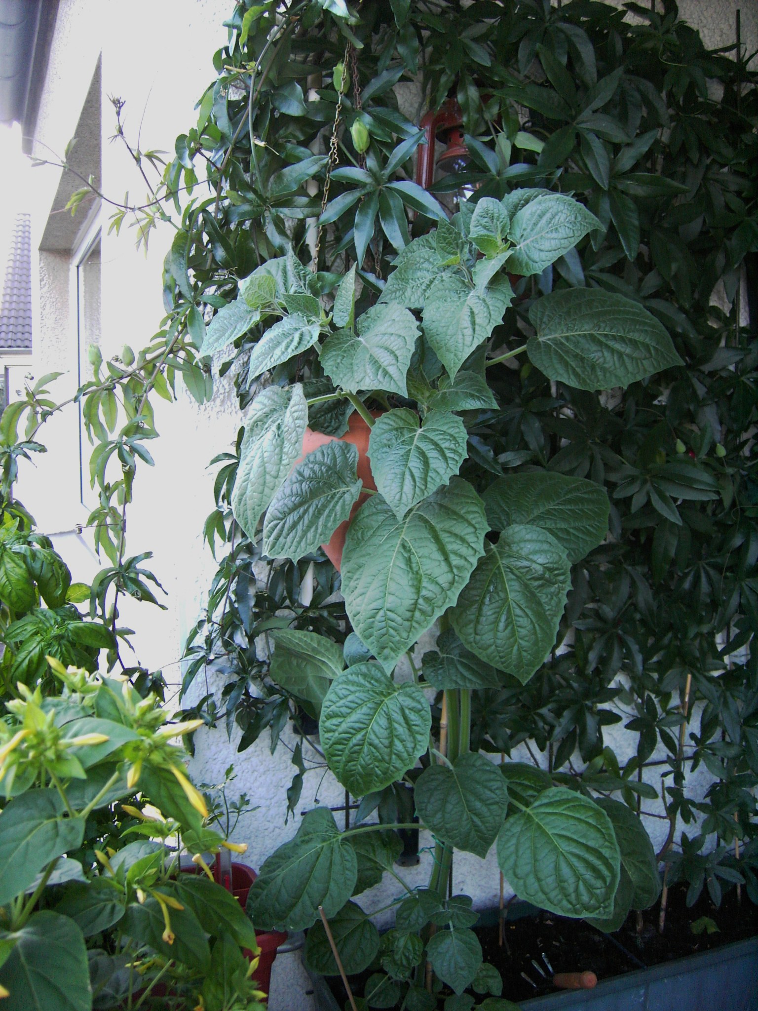 Vielleicht kann mir jemand sagen, was ich da für eine mir unbekannte Pflanze habe. Diese hatte sich bei mir im Blumenkasten selbst ausgesät. Sie wächst einträchtig zusammen mit meiner Passionsblume in einem Blumenkasten und hat ganz schön zugelegt in der letzten Woche.