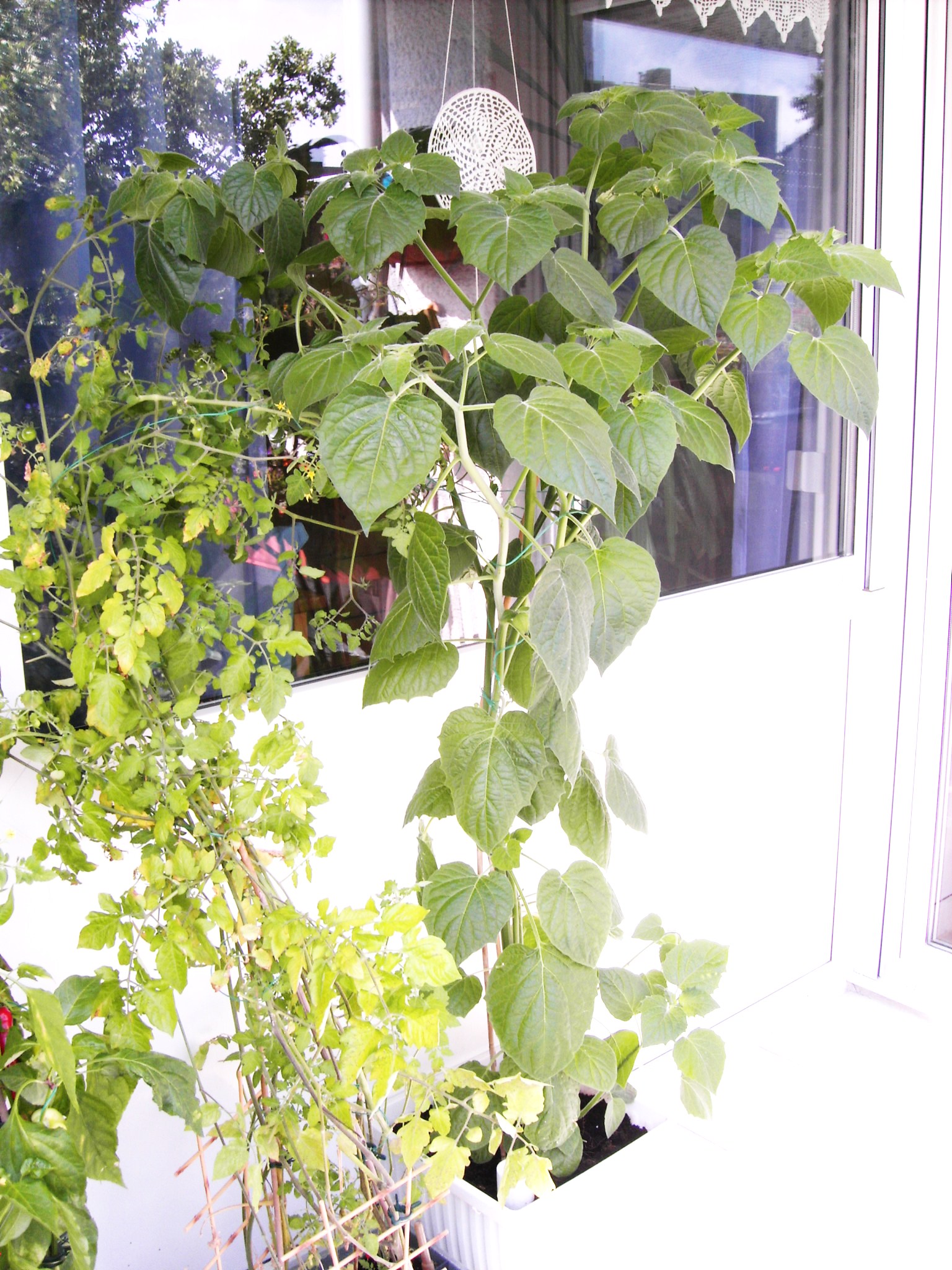 bei mir hat sich eine Physalis irgendwann im Mai selbst ausgesät. Zuerst war sie zusammen mit meiner Passionsblume in einem Blumenkasten, jetzt steht sie extra und wächst und wächst. Mittlerweile glaube ich an eine Mutation oder ist eine Höhe von 1,50 m noch normal? Ein paar grüne Lampions hängen jetzt auch schon dran. Nur konnte ich bisher die Art der Physalis noch nicht herausbekommen. Seht selbst!