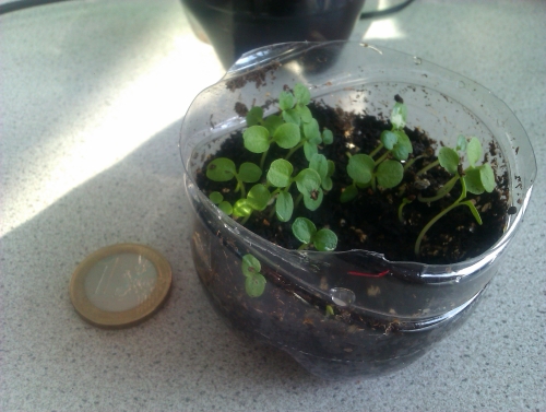 Meine [seltsamen Pflänzlein] sind jetzt wie wild gekeimt, haben aber noch keine eigenen Blätter.