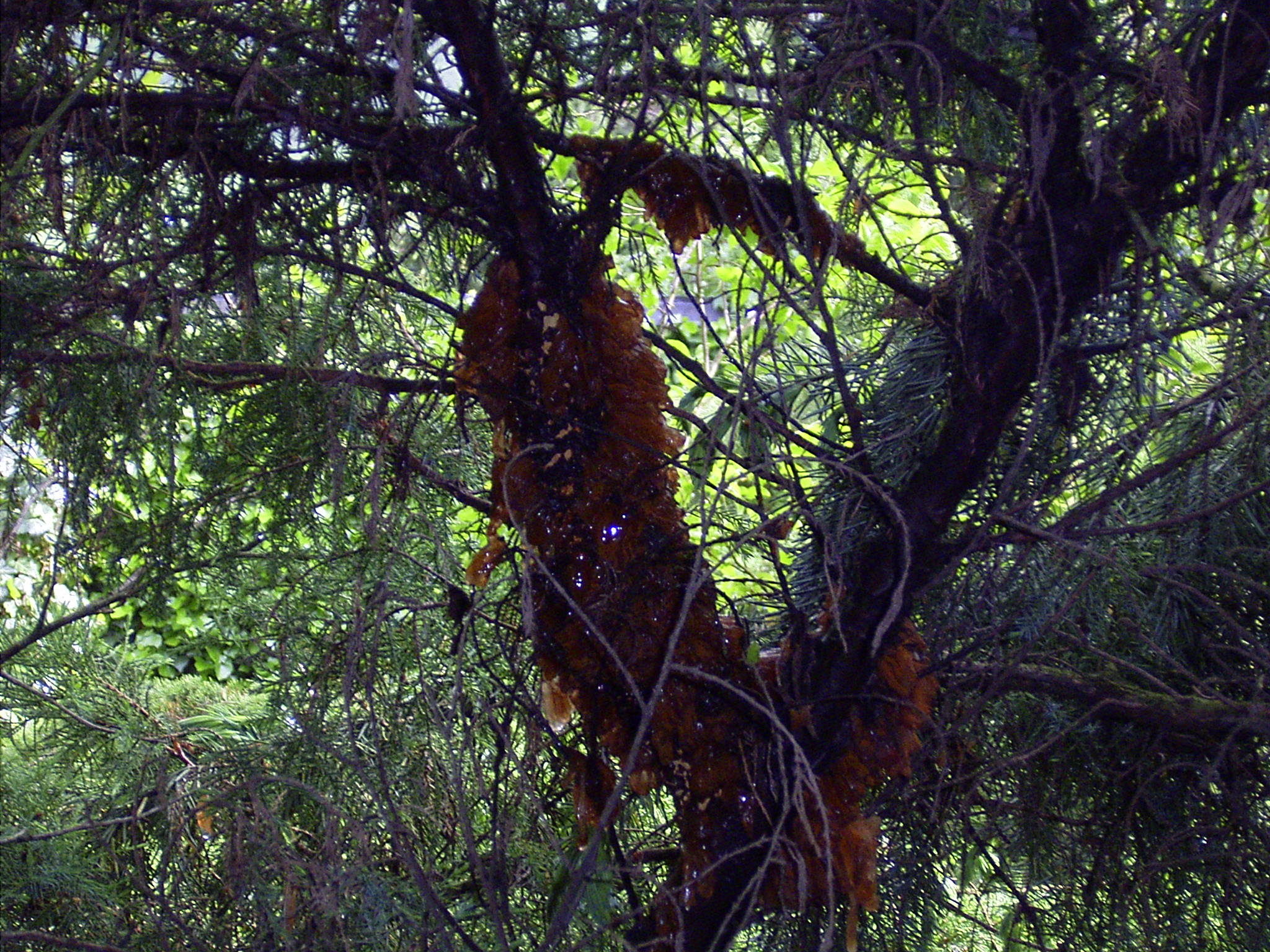 Erst fanden wir große Flatschen auf dem Boden (braun und glischig). Dann bemerkten wir, dass unter den Koniferen große bräunliche Brocken hingen.